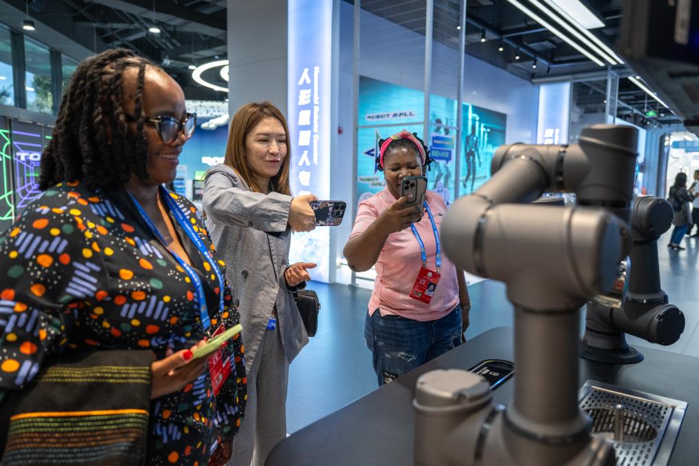 10月14日,全球妇女峰会参会嘉宾在北京经开区机器人大世界了解机器人制作咖啡。新华社记者 杜子璇 摄