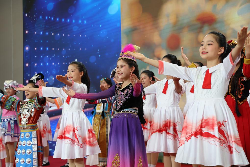 10月14日,全球妇女峰会配套活动“数智赋能妇女和女童成果展”在中国妇女儿童博物馆开展。春蕾梦想合唱团的孩子们在展览现场演唱《花开中国》。新华社记者 梁旭 摄
