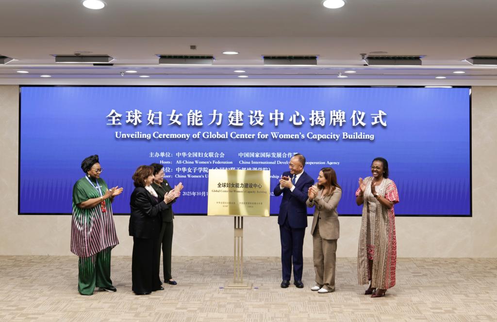 10月14日,全国妇联和国家国际发展合作署在中华女子学院举行“全球妇女能力建设中心”揭牌仪式。这是揭牌仪式现场。新华社记者 张玉薇 摄
