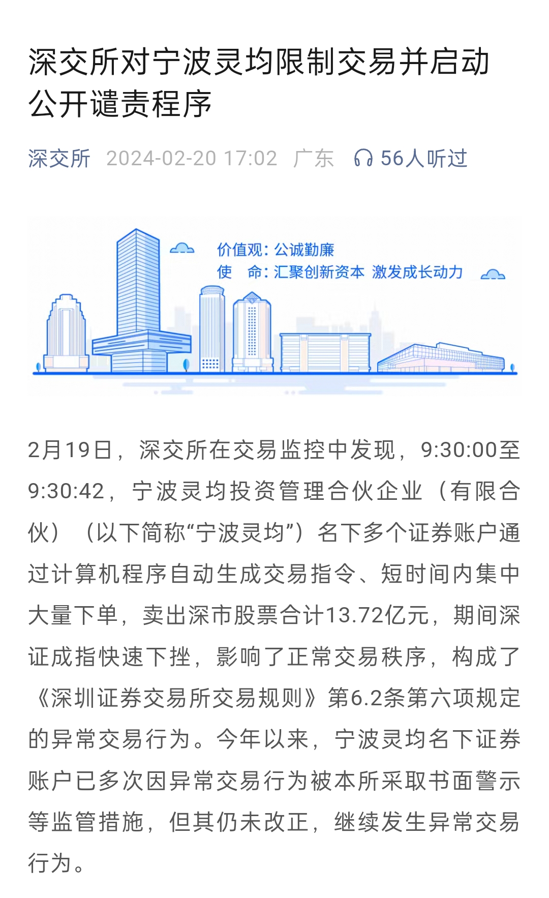 同日,上交所也在交易监控中发现,9:30:00至9:31:00,宁波灵均管理的多个产品大量卖出沪市股票合计11.95亿元,期间上证指数短时快速下挫。决定从2024年2月20日起至2024年2月22日止对宁波灵均管理的相关产品连续实施暂停投资者账户交易的监管措施,同时启动对宁波灵均予以公开谴责的纪律处分程序。