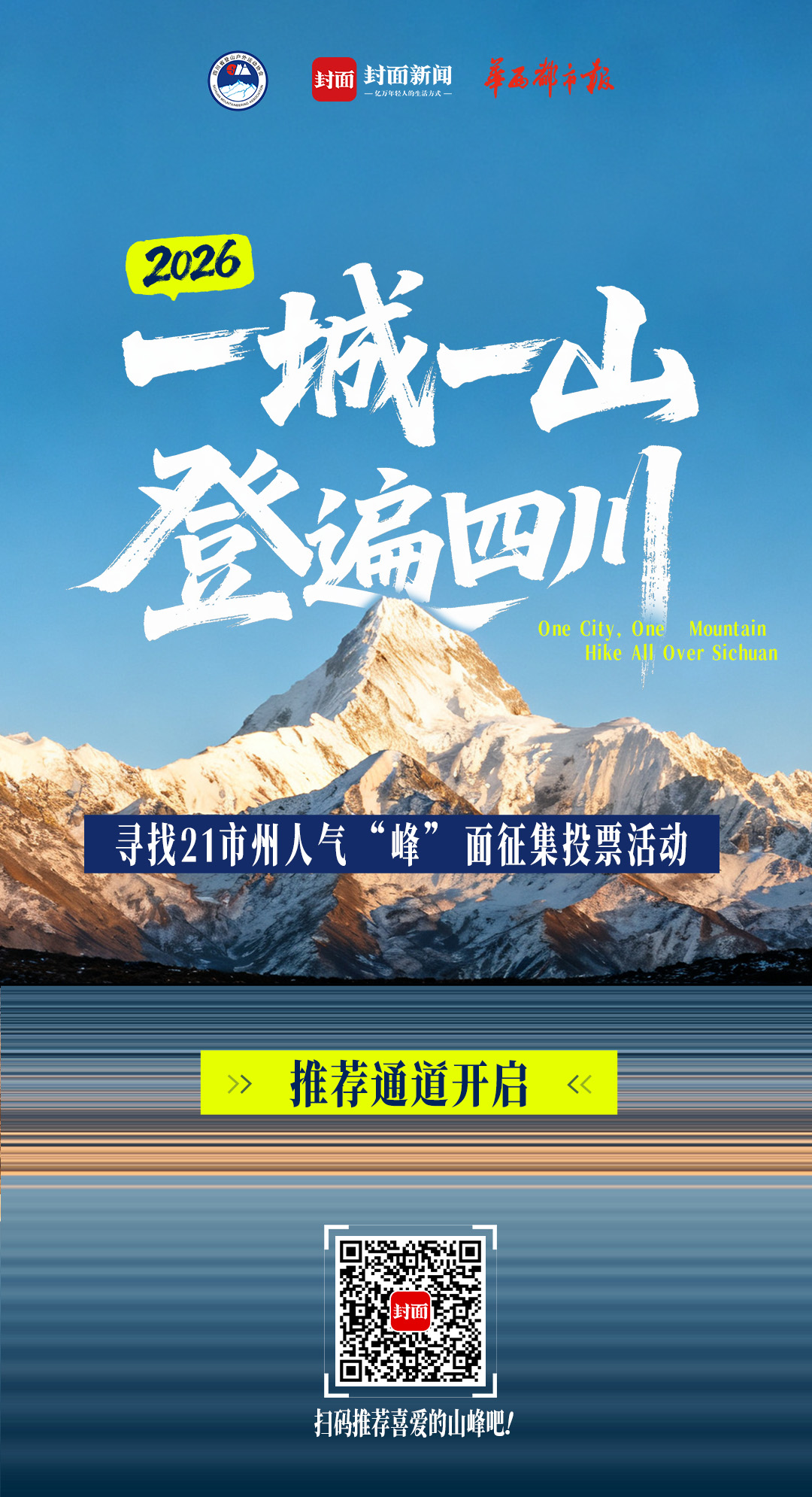为方便参与,活动开设便捷推荐通道,覆盖微信端与封面新闻APP。其中,封面新闻APP端可通过三种方式进入活动页:注册登录后点击首页悬浮球;在“我的”页面找到“热门活动”板块进入;通过2026“一城一山·登遍四川”专题及相关文章的活动入口参与。微信端则直接扫活动宣传二维码,或点击活动链接,一键直达推荐页面。
