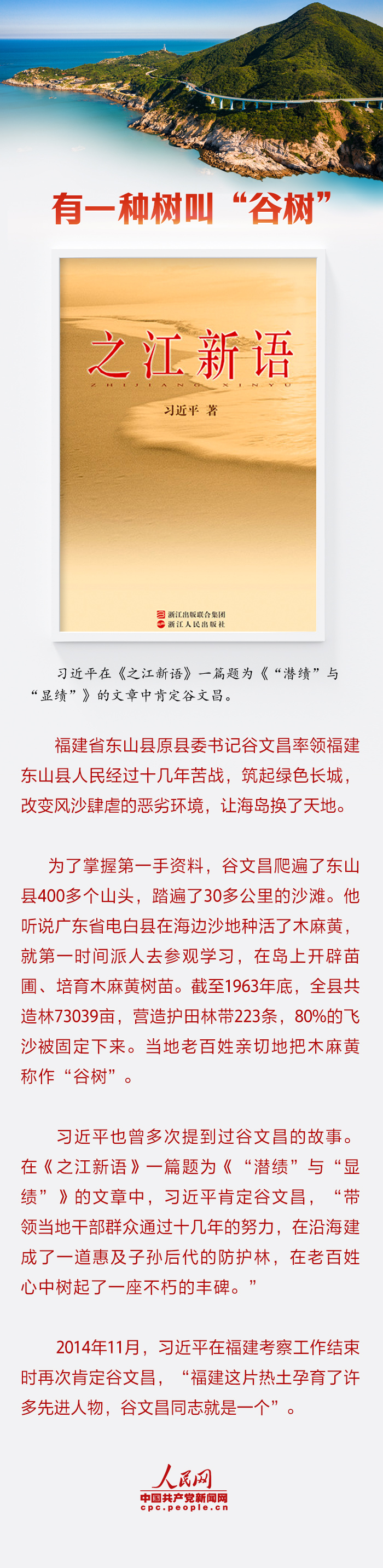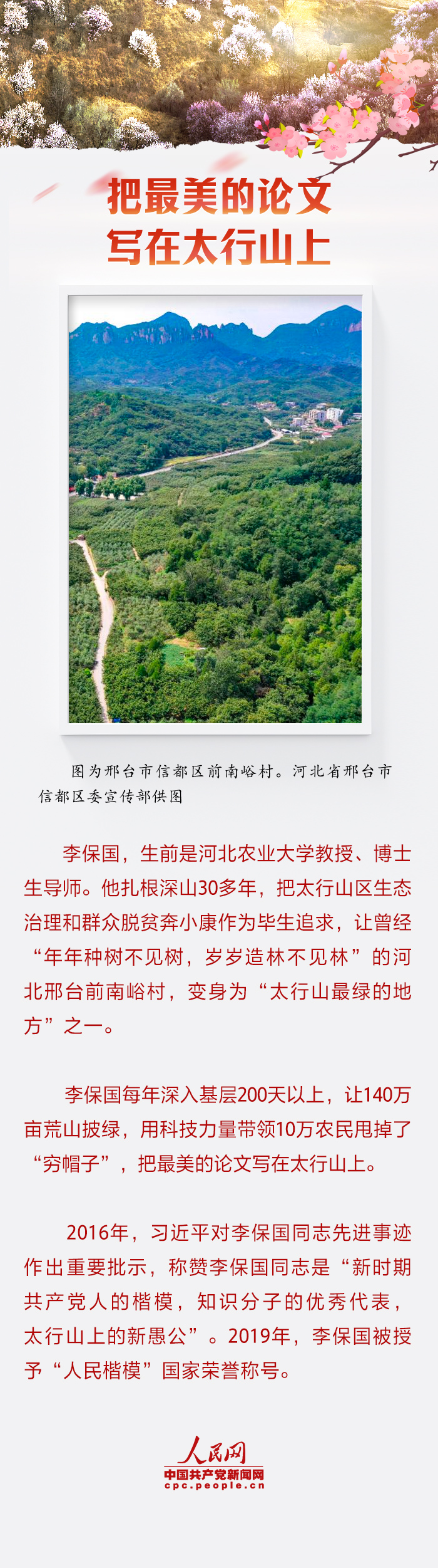 习近平总书记连续十多年履行与春天的“绿色约定”,心系国土绿化事业,引领推进生态文明建设。“抓生态文明建设,既要靠物质,也要靠精神。”习近平总书记曾多次提到英模厚植精神之“树”为人民谋幸福的事迹,一起学习领悟。