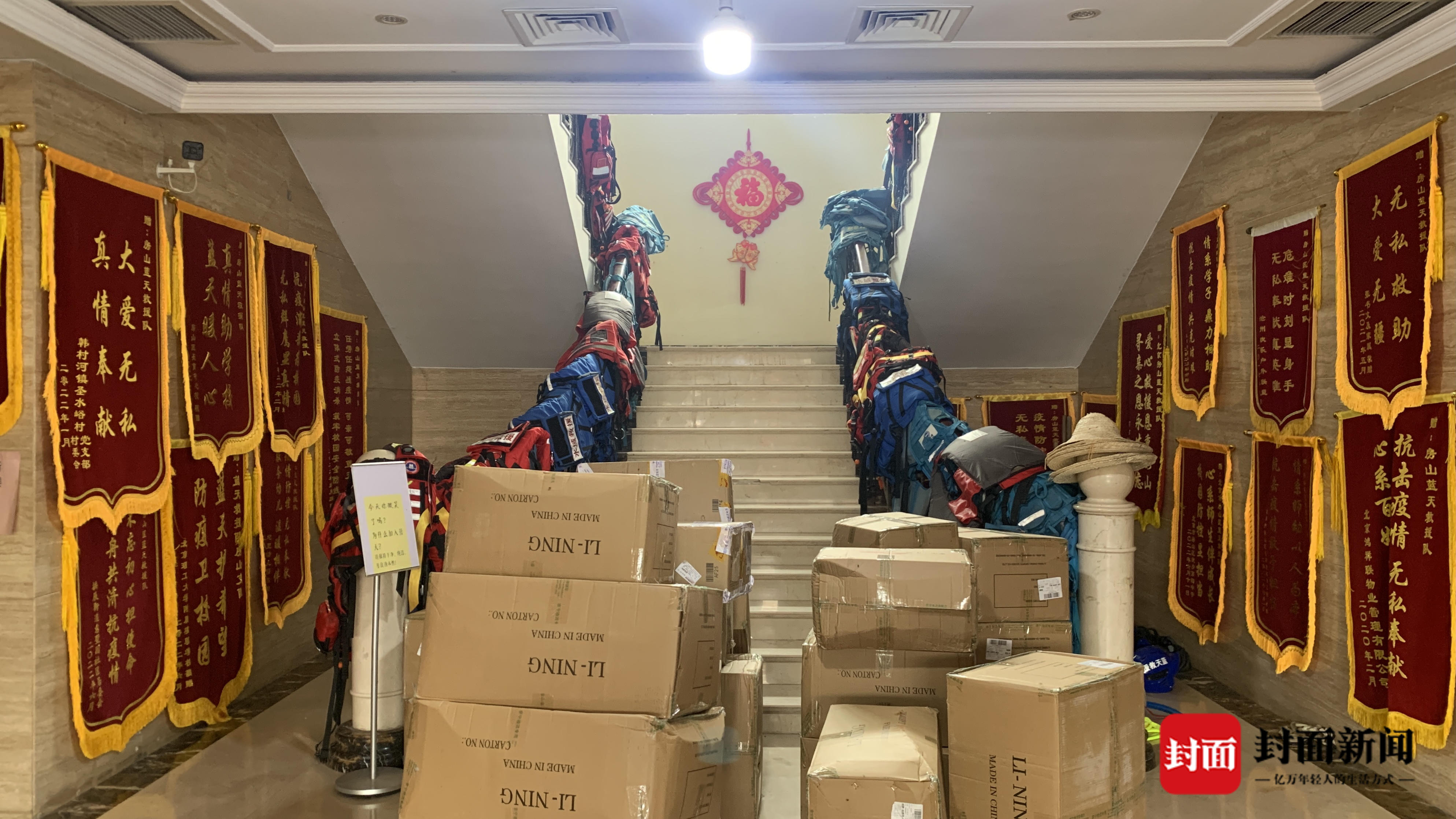 8月10日,房山蓝天救援队,用于水域救援的浮力马甲晾晒在楼梯扶手上,大厅堆满了救援物资。封面新闻见习记者 何金蓝摄影