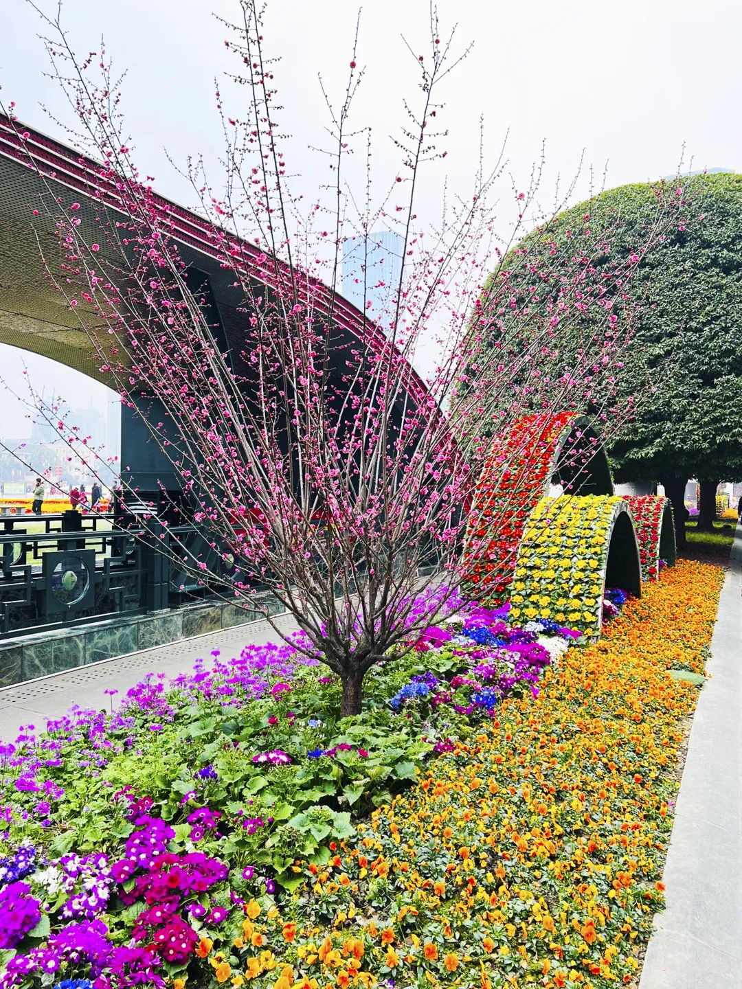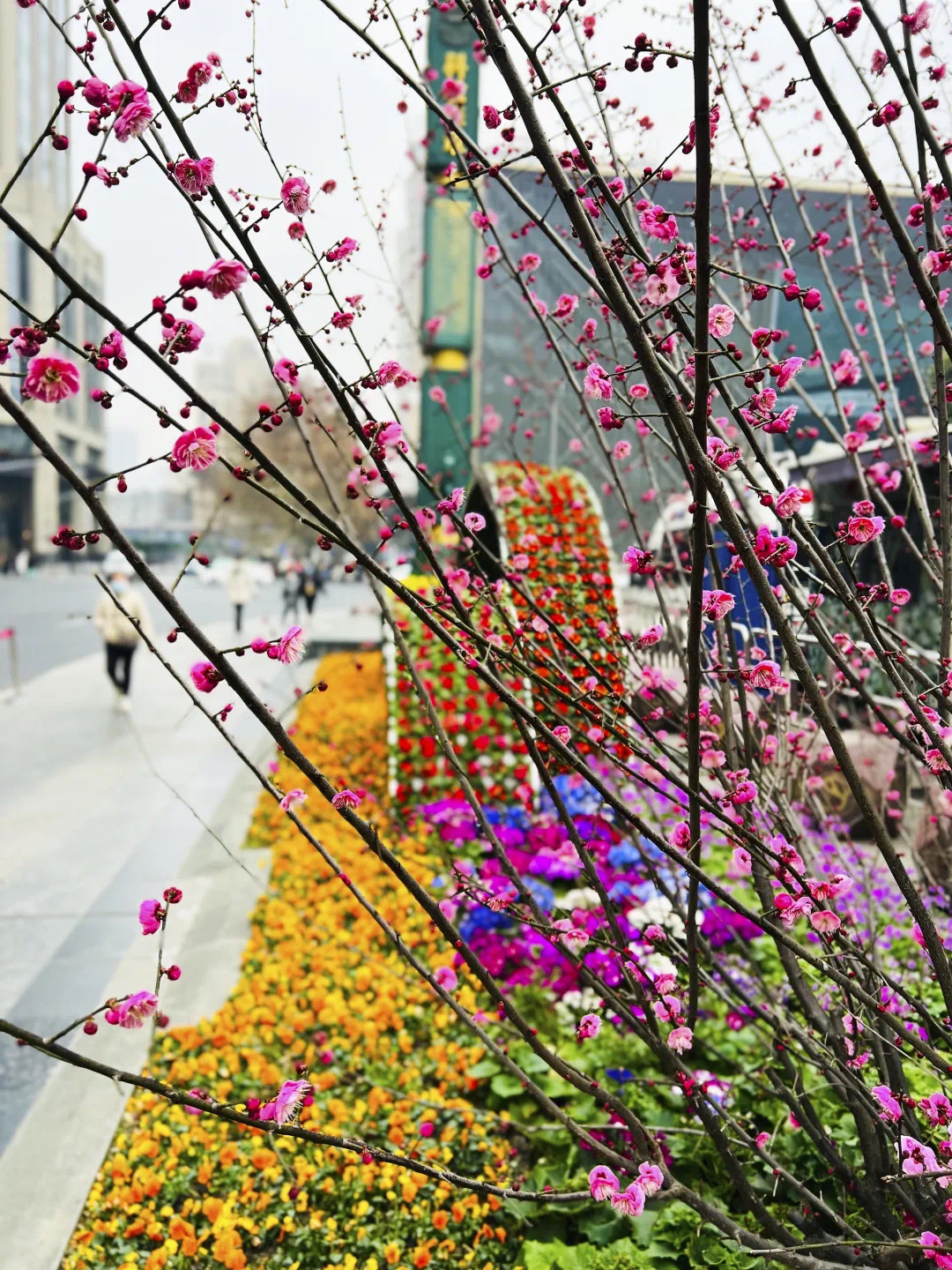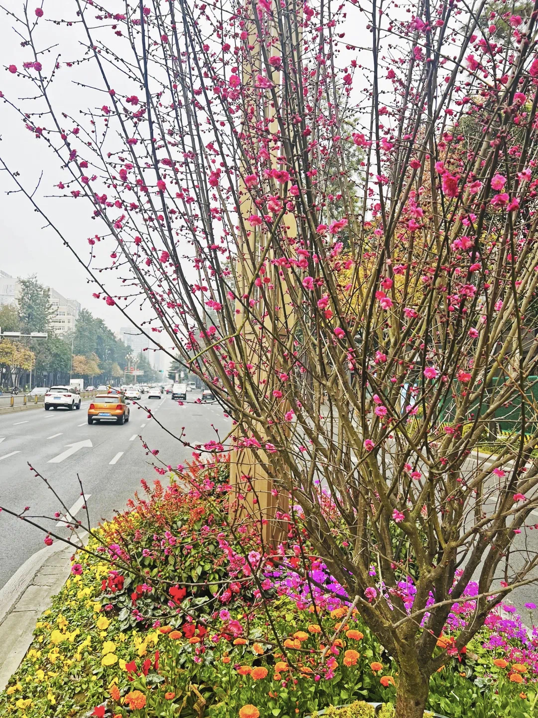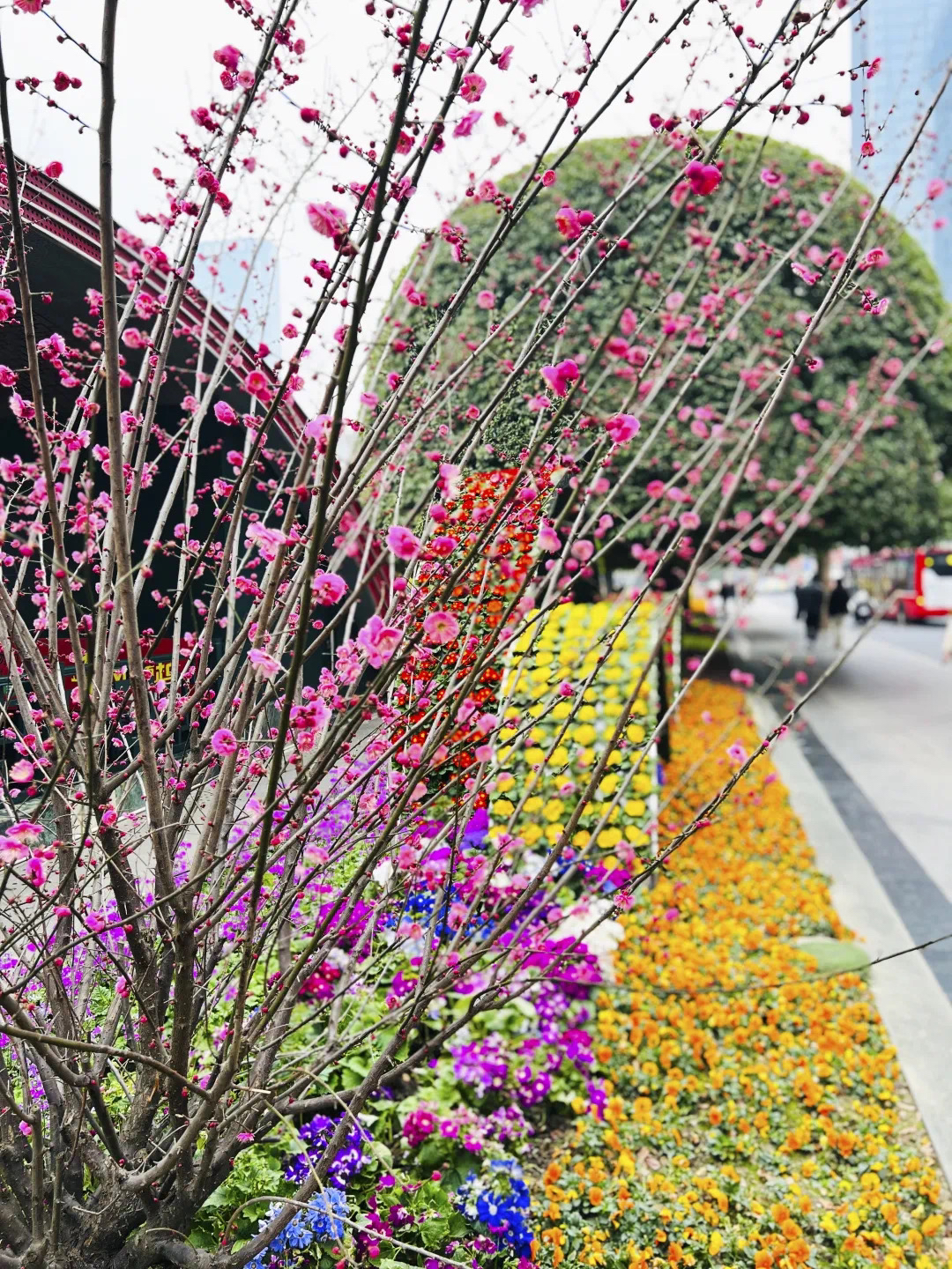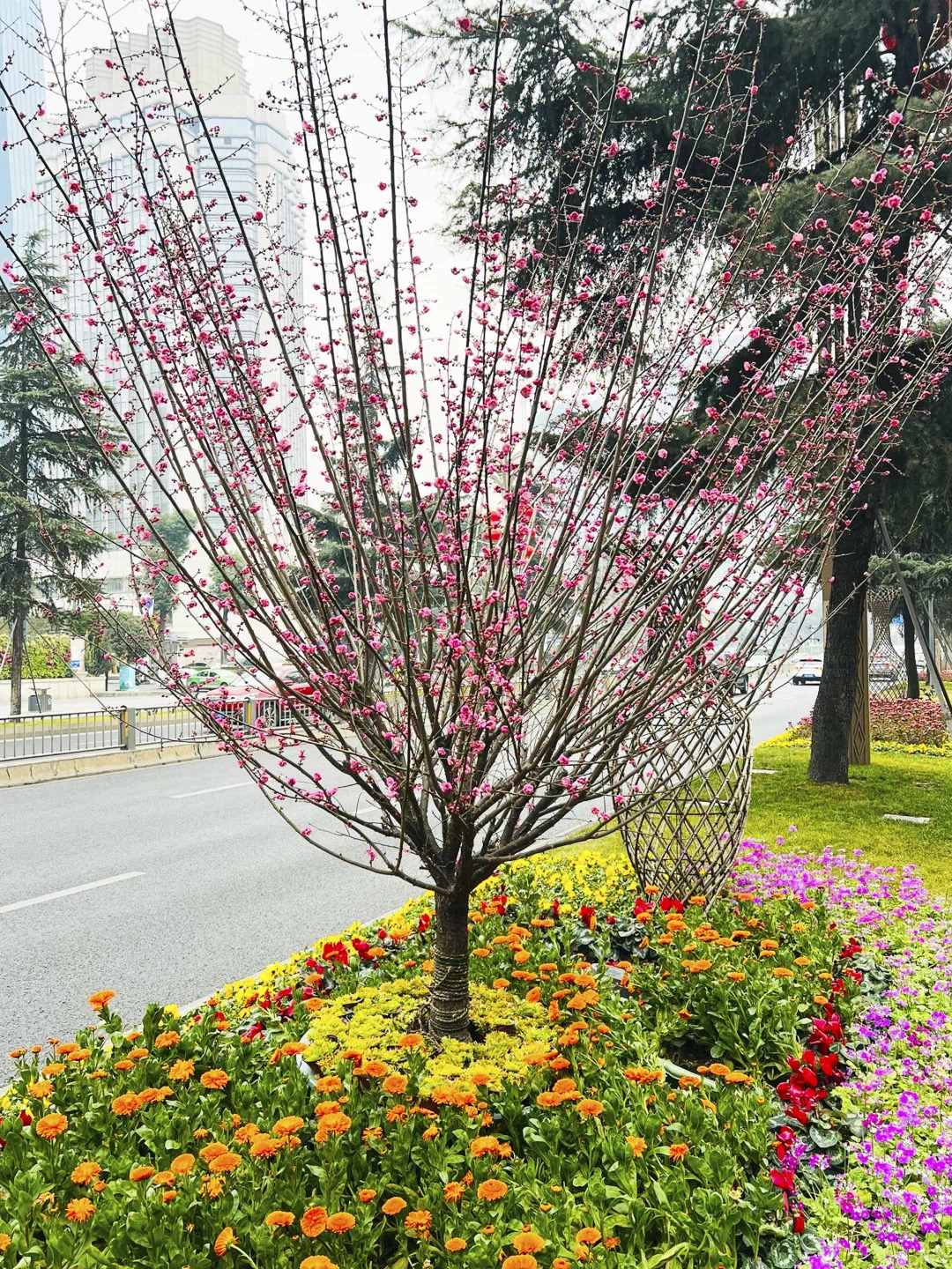 随着立春节气已过,不少细心的市民游客在途经成都天府广场周边、人民南路沿线、天府大道北段等区域时,已经发现了在道路两旁花坛中多出了不少“红梅”。它们有的含苞待放,有的花瓣舒展,粉色花朵层层叠叠缀满枝头,与周围的花卉植物共同构成一派明媚的春日景象。