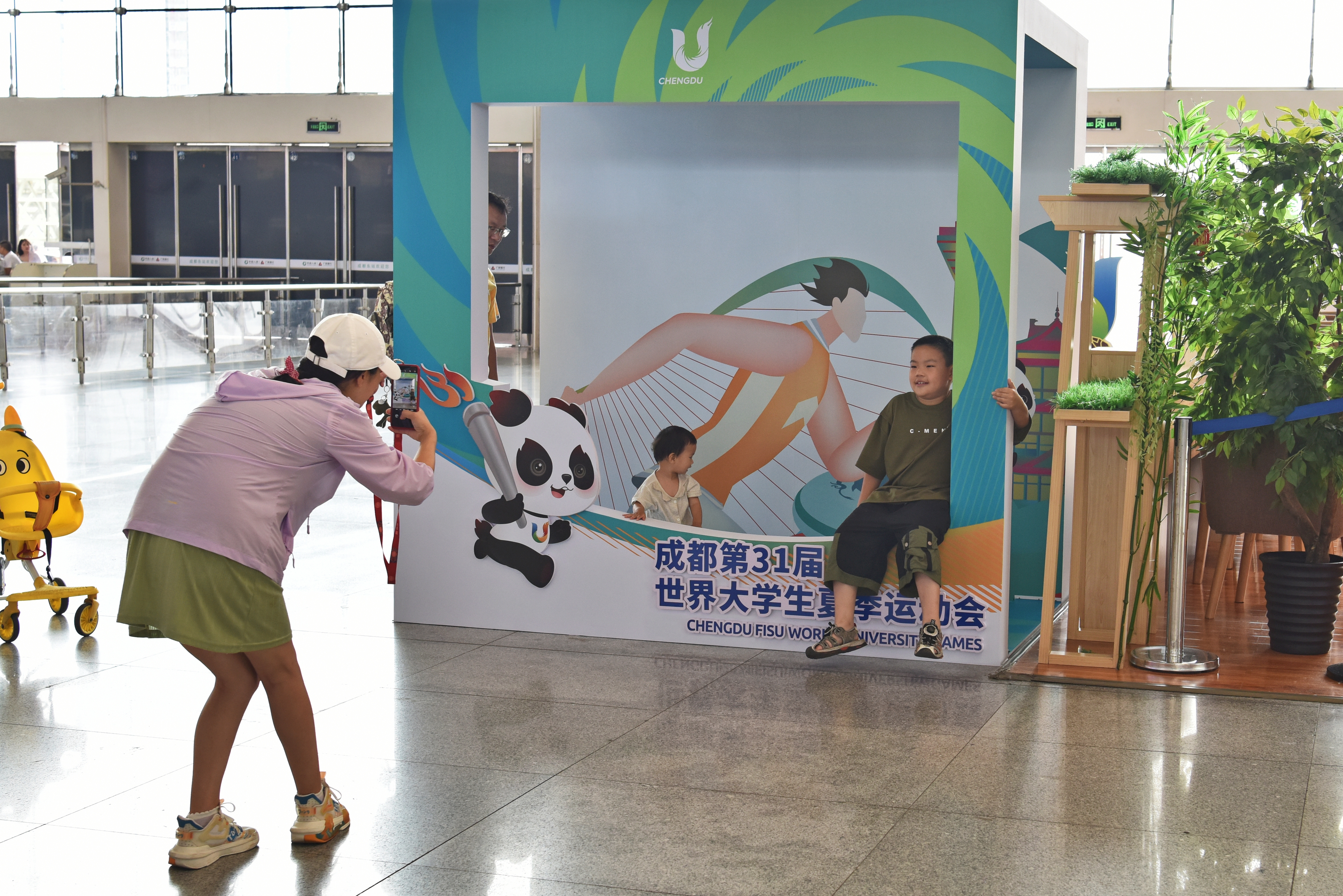 “乖乖,来站到这边我给你拍个照。”27日上午,准备坐车去重庆的王女士在成都东站候车室发现了一处大运会打卡点,立马叫来女儿拍照留念。
