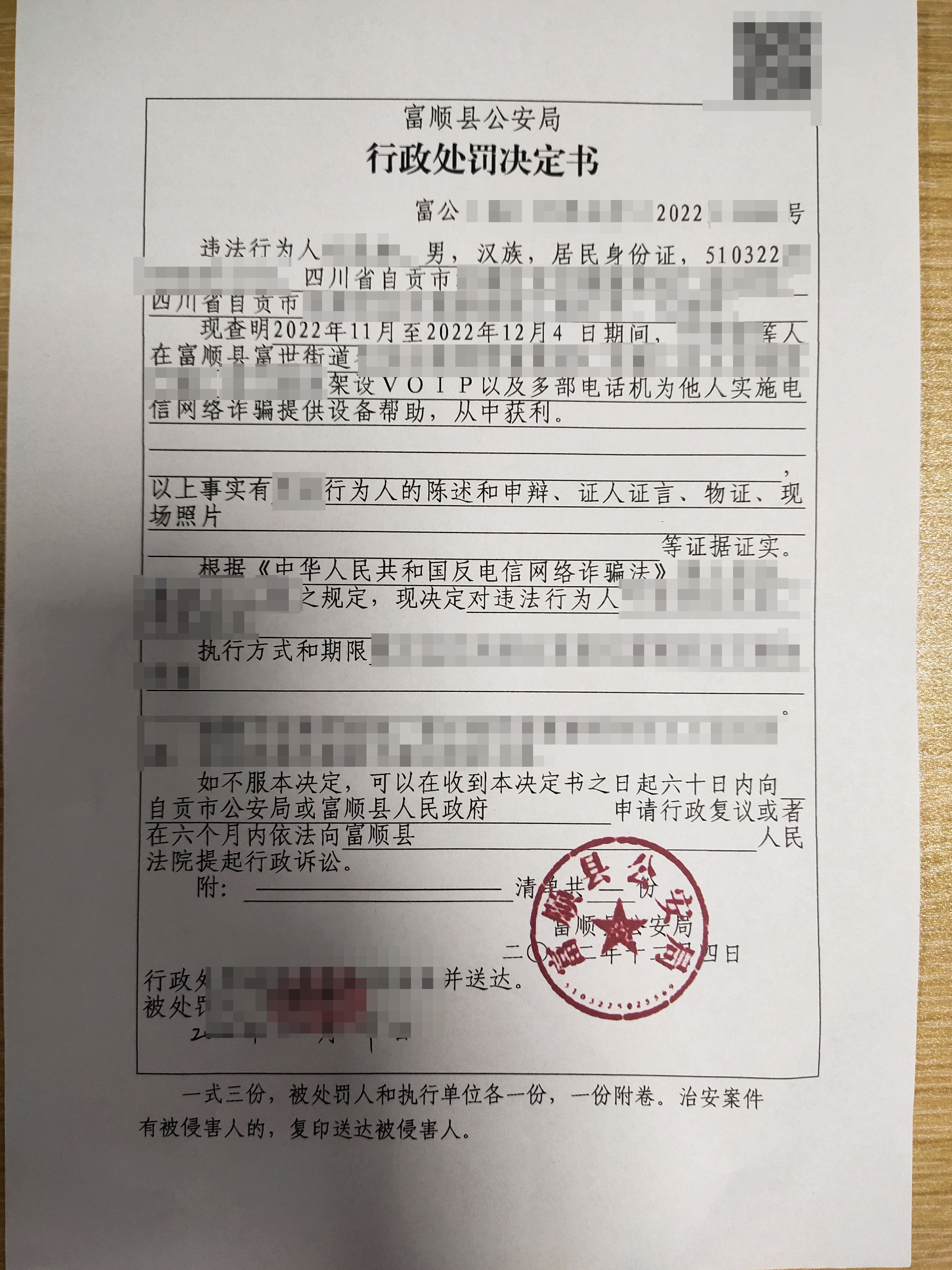 据了解,这是《中华人民共和国反电信网络诈骗法》12月1日正式施行后,自贡市公安机关实施的首例行政处罚。
