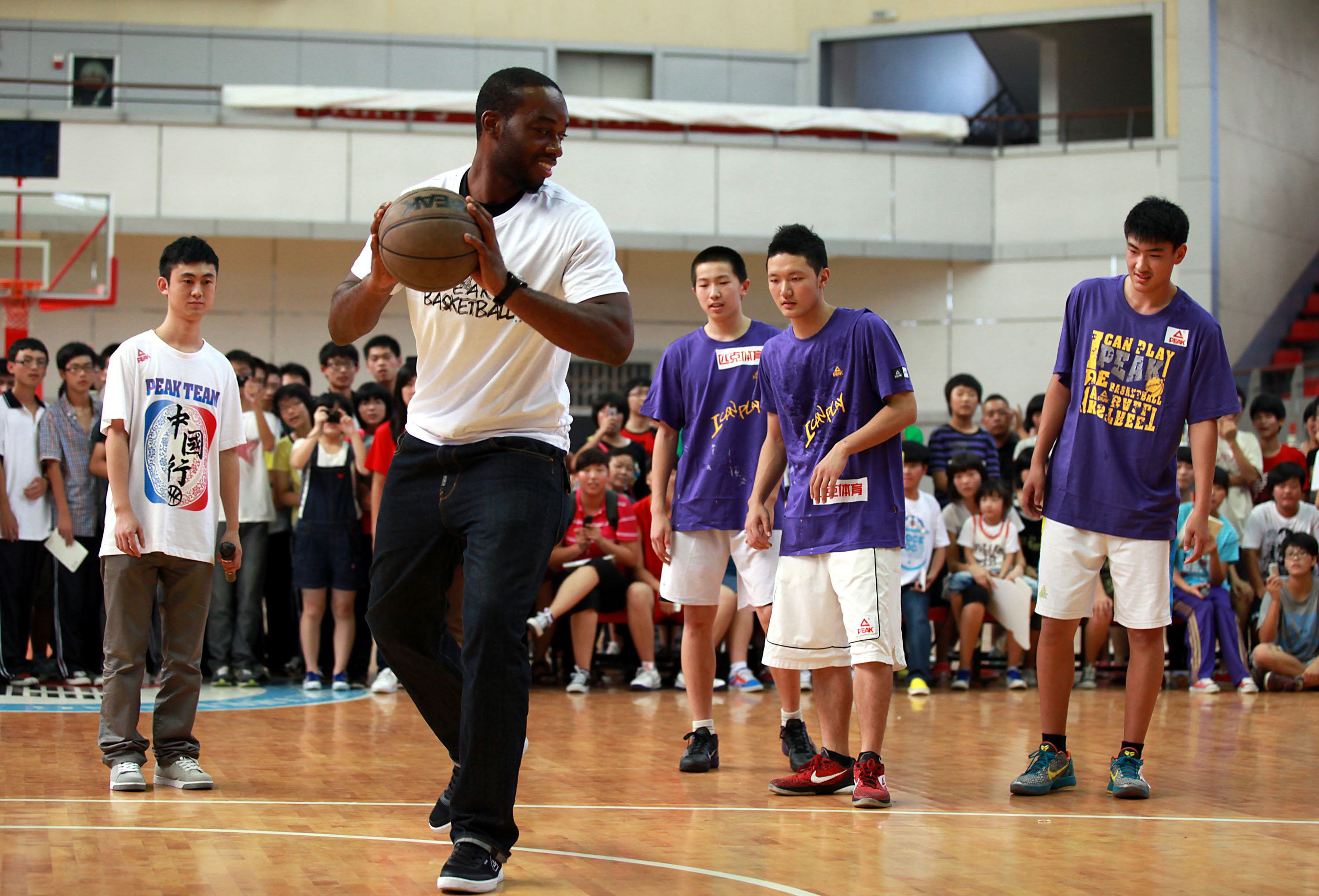 资料图:2011年9月10日,当时的NBA球星卡尔·兰德里在回浦中学传授篮球技艺。孙金标 摄