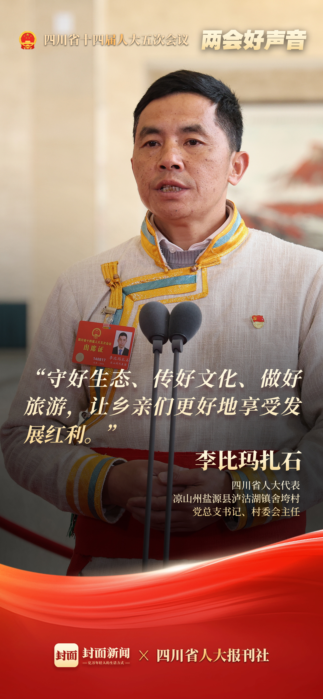 面对旅游开发的机遇,省人大代表、泸沽湖镇舍垮村党总支书记李比玛扎石,想着更长久的事:怎样让眼前的山水,变成百姓永续的“幸福银行”?