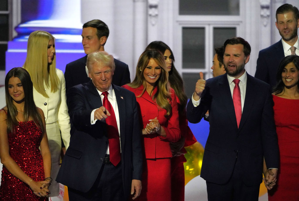 7月18日,美国前总统特朗普(前排左二)和共和党副总统候选人万斯(前排右二)在共和党全国代表大会上向观众致意。新华社记者吴晓凌摄