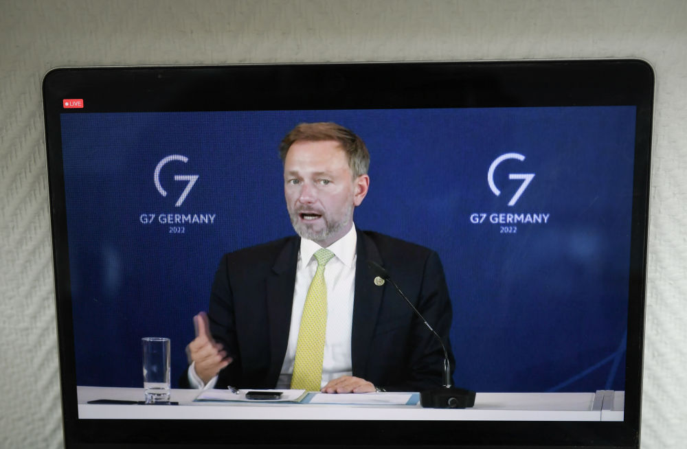 这是2022年5月20日在德国法兰克福拍摄的德国财长林德纳在七国集团财长和央行行长会议后出席新闻发布会的视频直播画面。新华社记者逯阳摄