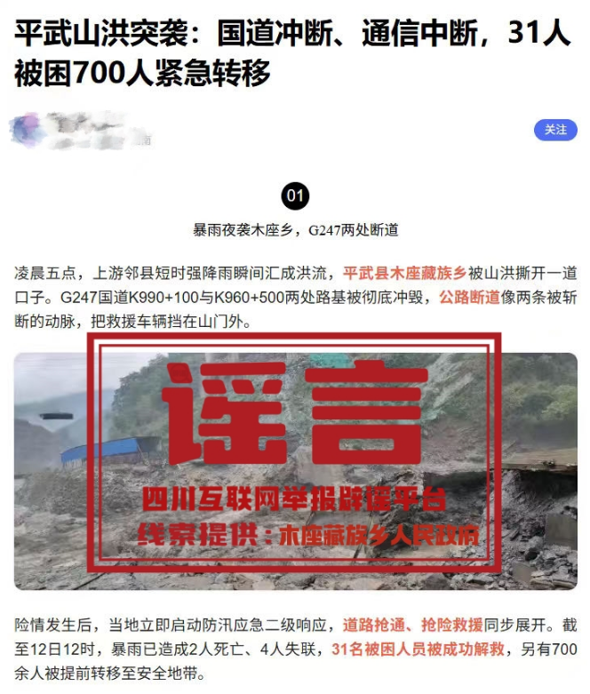 谣言:四川绵阳平武山洪突袭,国道冲断、通信中断?