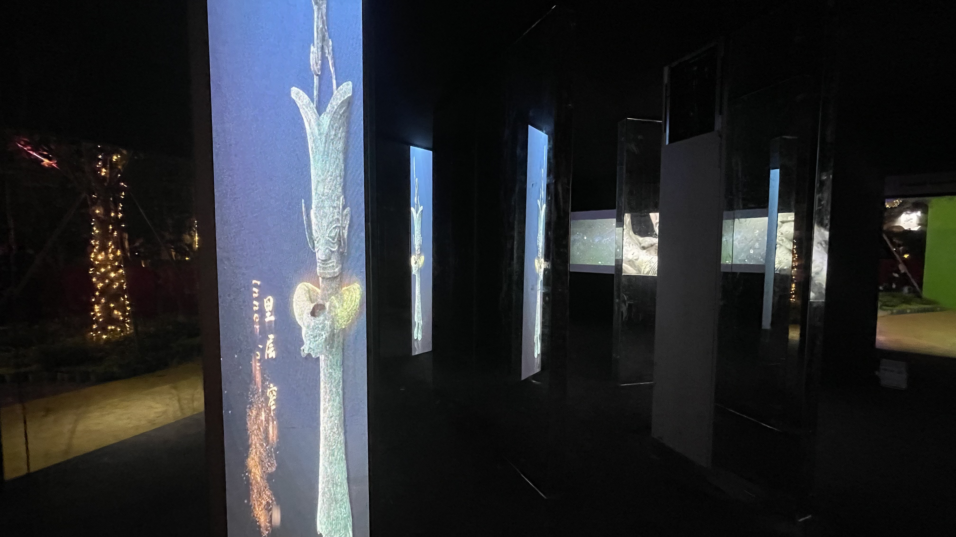 “梦回古蜀,遗迹穿越”户外裸眼3D展示单元,通过裸眼3D的技术创作,文物内容仿佛飞跃出屏幕,来到真实空间,给观众从铁像寺穿越回古蜀国的沉浸体验,感受古蜀文明与现代文创的呼应。