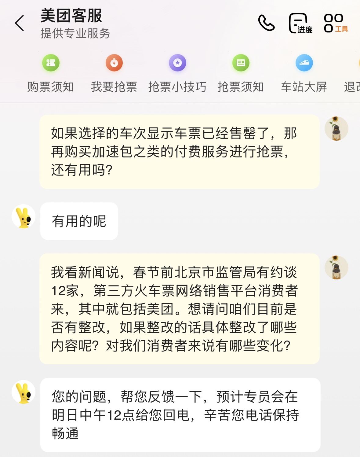 美团客服向记者表示,“双通道抢票概率更大一点”,并解释“在12306上只能候补,不能抢票。”记者询问“如果车次显示车票已经售罄了,那再购买加速包之类的付费服务进行抢票,还有用吗?”客服明确回答“有用”。
