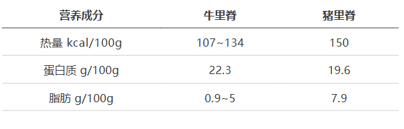 每 100 克牛里脊的蛋白质含量为 22.3 克,猪里脊为 19.6 克,都是高蛋白选手;牛里脊的脂肪含量仅为 5 克/100 克,比猪肉的 7.9 克/100 克只是略低一些,二者热量相差不大,均为 140 千卡左右。