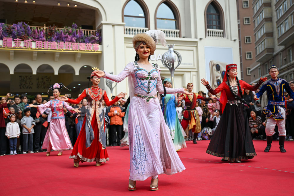 ↑ 10月1日,在新疆乌鲁木齐市新疆国际大巴扎,演员进行开街表演。