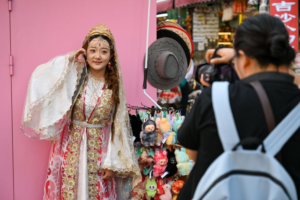 ↑ 10月1日,游客在新疆国际大巴扎体验旅拍。
