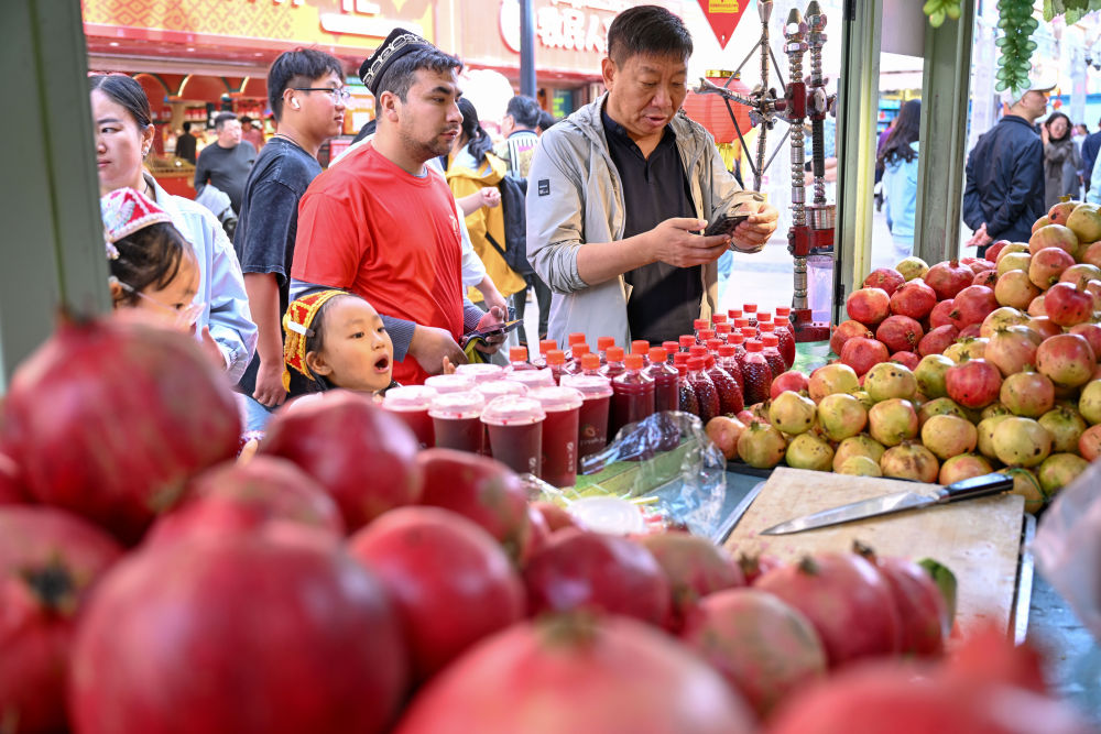 ↑ 10月1日,游客在新疆国际大巴扎选购饮品。