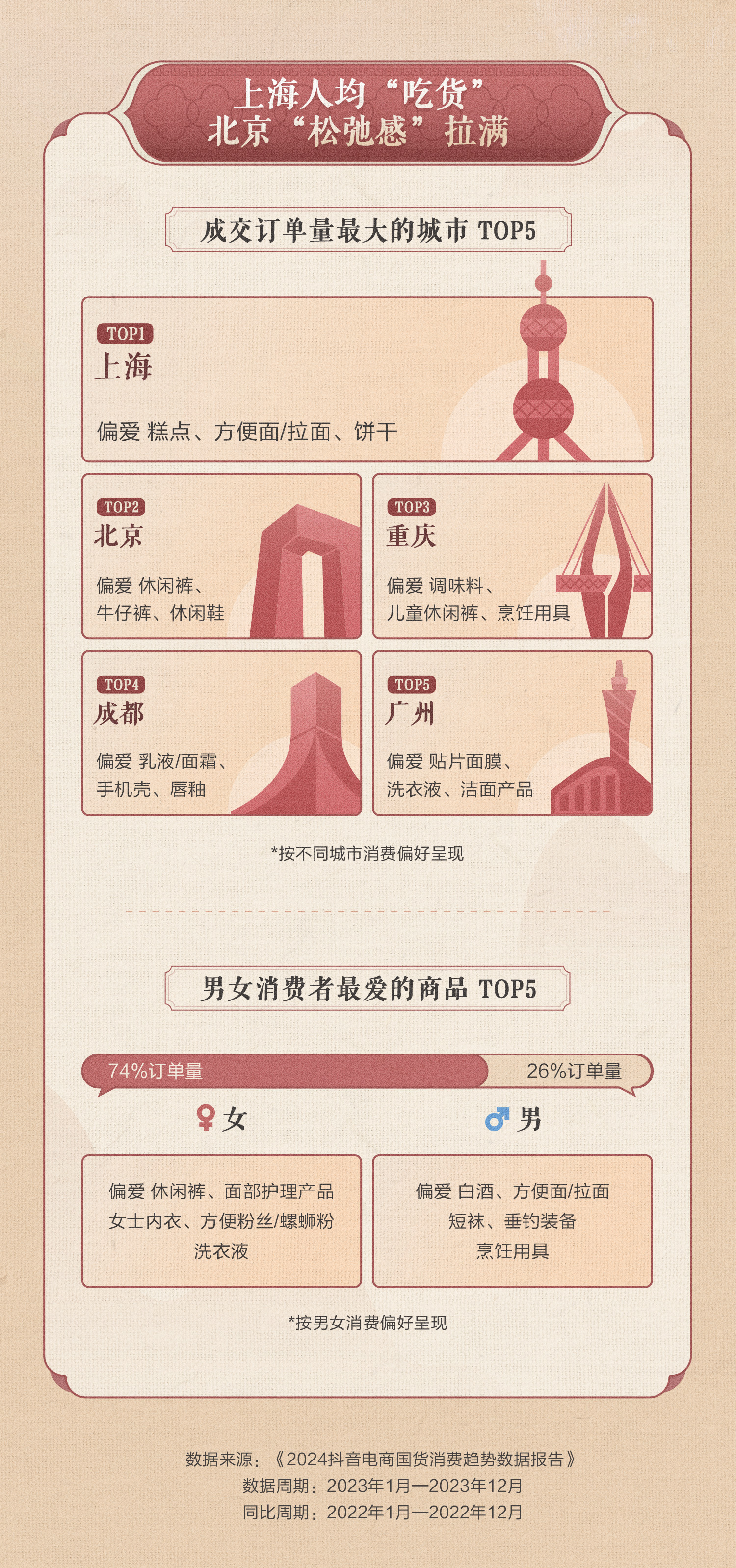 从消费人群来看,女性消费者下单更多国货,成交订单量占比74%,偏爱购买休闲裤、面部护理产品、女士内衣、方便粉丝/螺蛳粉、洗衣液等;男性消费者占比26%,偏爱购买白酒、方便面/拉面、短袜、垂钓装备、烹饪用具等。