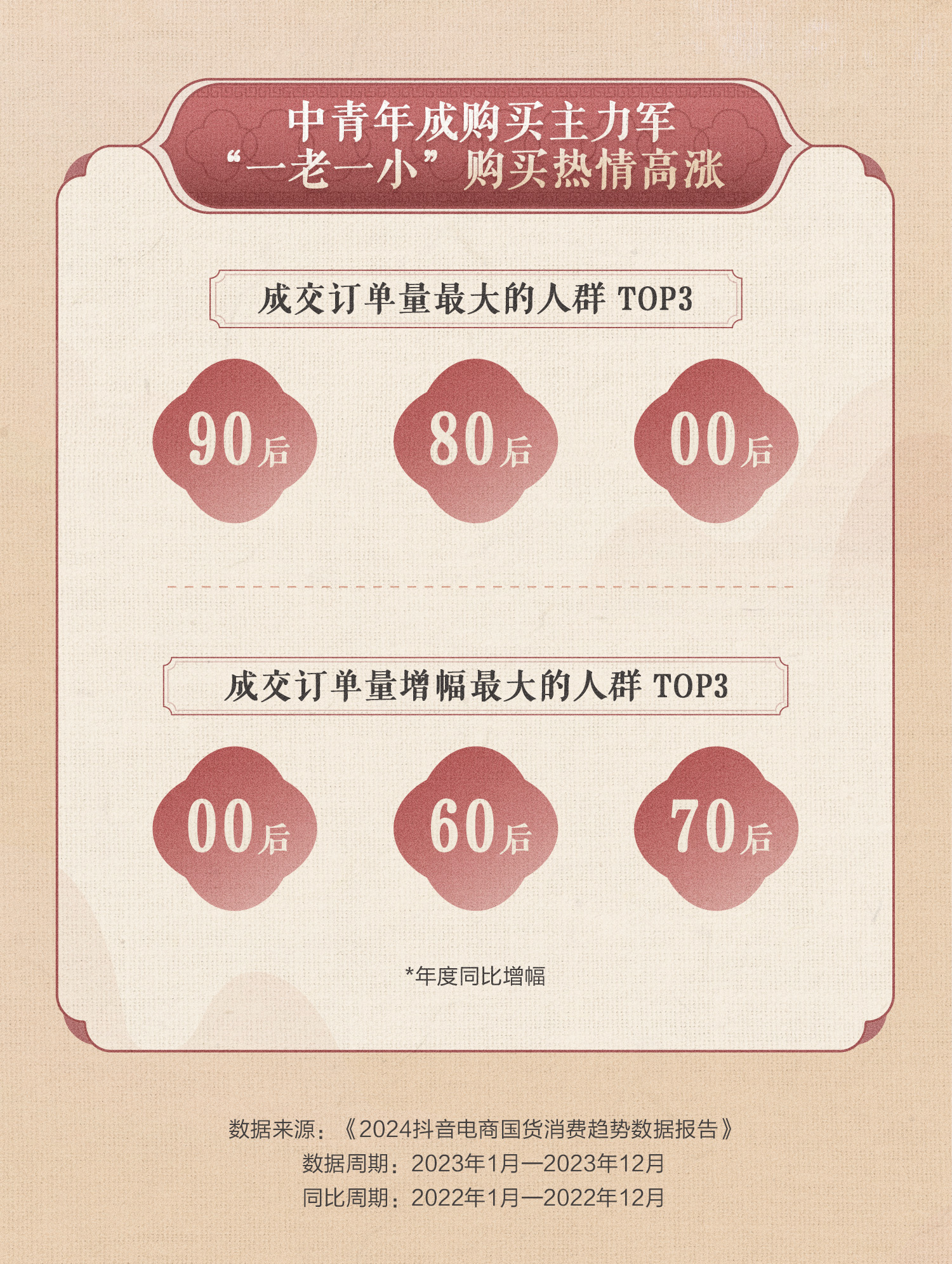 近年来,在抖音电商“遇见好国货”计划的助力下,越来越多新老国货在抖音电商找到发展新路,国货消费热度节节攀升。报告显示,“90后”“80后”“00后”等年轻群体最爱买国货,“00后”“60后”“70后”购买热情高涨,成交订单量年同比增幅位居前三。