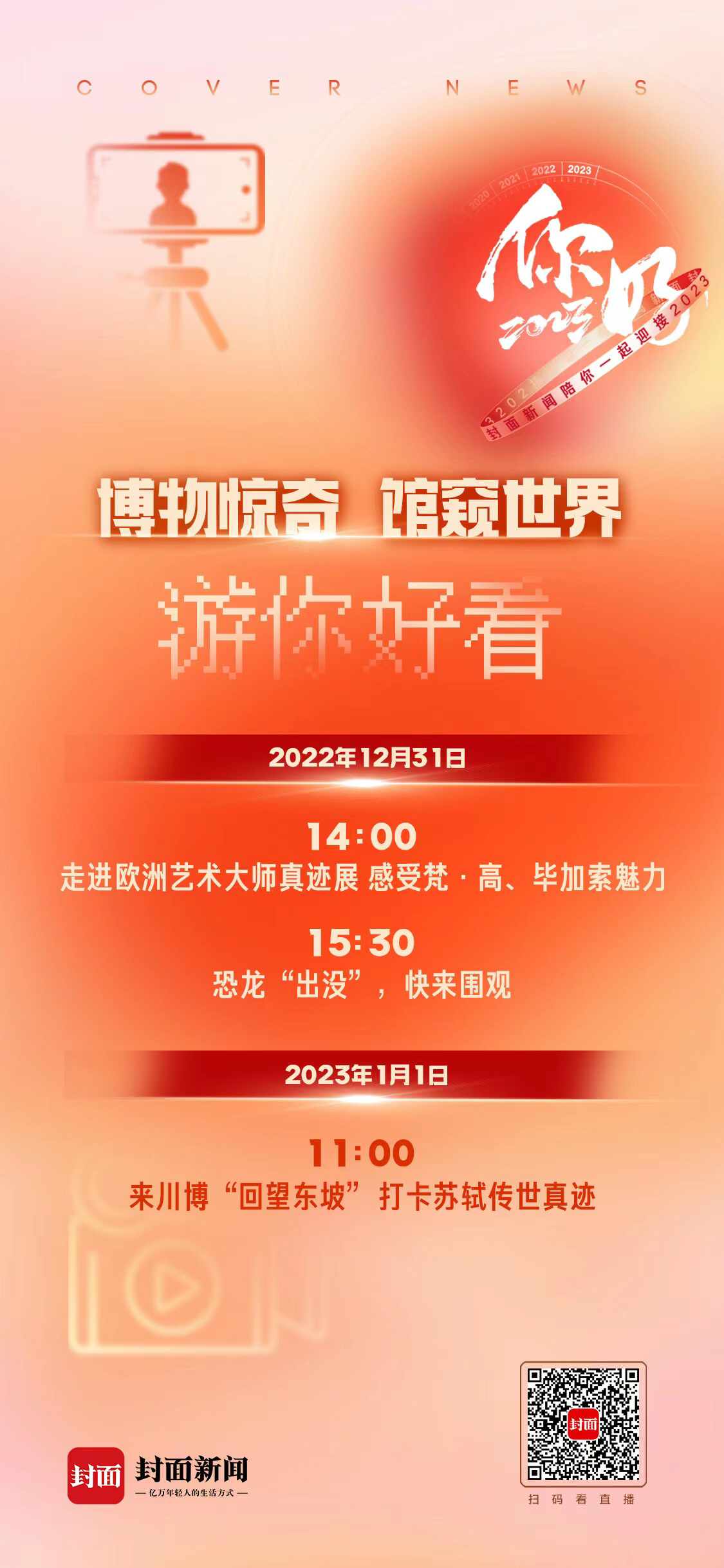 12月31日,封面新闻开启“你好2023”大型系列跨年直播,其中一站就是走进这所自然博物馆,在讲解员裴维德的带领下逛展厅,围观合川马门溪龙化石、隆昌铁陨石、大竹重庆鱼化石三大镇馆之宝,领略自然的奥秘。
