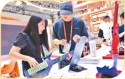 参展人员在消博会免税与高端精品展区体验赛博吉他。