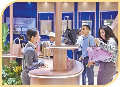 消博会免税与高端精品展区,参展人员在选购产品。 以上图片均为本报记者蒋雨师摄 制图:汪哲平