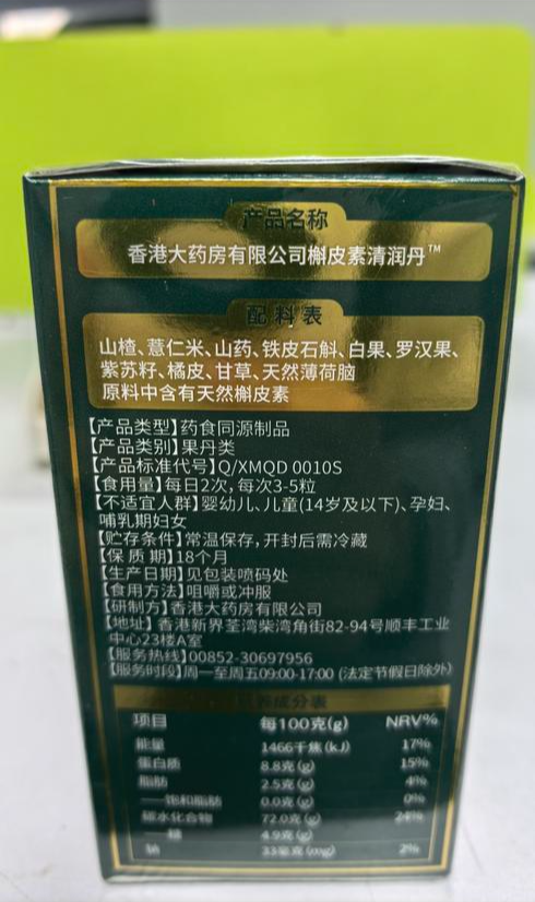 宣称百年信赖、古方熬制的香港大药房槲皮素清润丹,主播说槲皮素含量16克。包装盒信息显示,这是一款药食同源果丹类制品,成分表中仅有能量、蛋白质等成分含量,未标注槲皮素含量。送检显示,每100克产品中含有槲皮素0.0025克,含量接近于零。