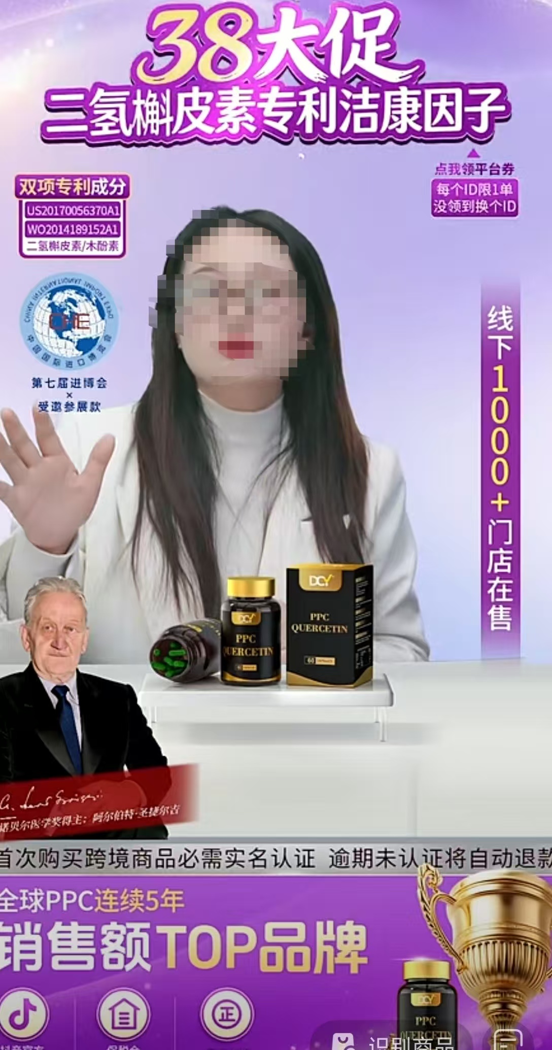 宣称诺贝尔奖得主发明,能治疗肺结节、甲状腺结节、支气管炎等多种疾病的澳洲DCY槲皮素,每粒含110毫克二氢槲皮素。主播称折算成普通槲皮素,相当于1100毫克。