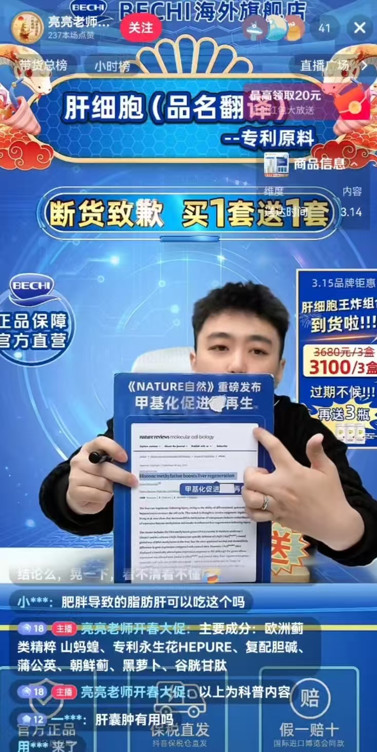 BECHI客服称,因货仓在整理库存,三五天后恢复上架。记者表明身份,希望采访、了解主播宣称的《自然》研究结论,以及该产品对这项研究的应用。对方表示“我们是外包客服”。