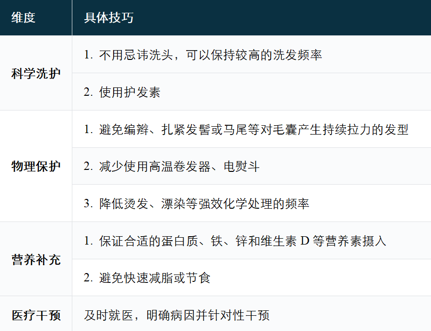 想要有效地减少掉发,建议从科学洗护、物理保护、营养补充以及医疗干预这几个维度共同发力。首先,分享一个反直觉的知识点——不应盲目减少洗头次数,对于亚洲人群的研究显示,保持较高的洗发频率(如每周 5~6 次甚至每天洗发)对头皮和头发健康更有利。如果洗发频率过低,头皮积聚的皮脂会发生氧化反应,产生刺激性物质引发炎症和瘙痒,这与掉发风险的增加直接相关。在日常习惯方面,应尽量减少或者避免编辫、扎紧发髻或马尾等对毛囊产生持续拉力的发型,以防诱发牵拉性脱发。另外,戒烟有助于降低脱发风险,并建议通过调节压力来避免因心理因素导致的脱发。同时,减少频繁使用高温卷发器和电吹风,还要尽量降低烫发、漂染等强效化学处理的频率,因为这些行为会破坏发丝的表层结构,使其变得多孔且脆弱易碎。我们知道,头发主要成分是蛋白质,除此之外,还有水分、脂质、微量元素。要想让头发健康生长,需要有充足的蛋白质、铁、锌和维生素 D 等微量元素和维生素。因此,大家要特别要警惕,避免快速减脂或节食,这容易引起营养摄入不足,进而诱发弥漫性的休止期脱发。如果有发量异常的迹象,建议大家当及时就医,明确病因,然后针对性地干预。这里,我们也用表格的方式再次梳理,供大家参考。