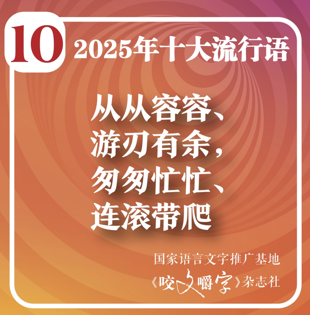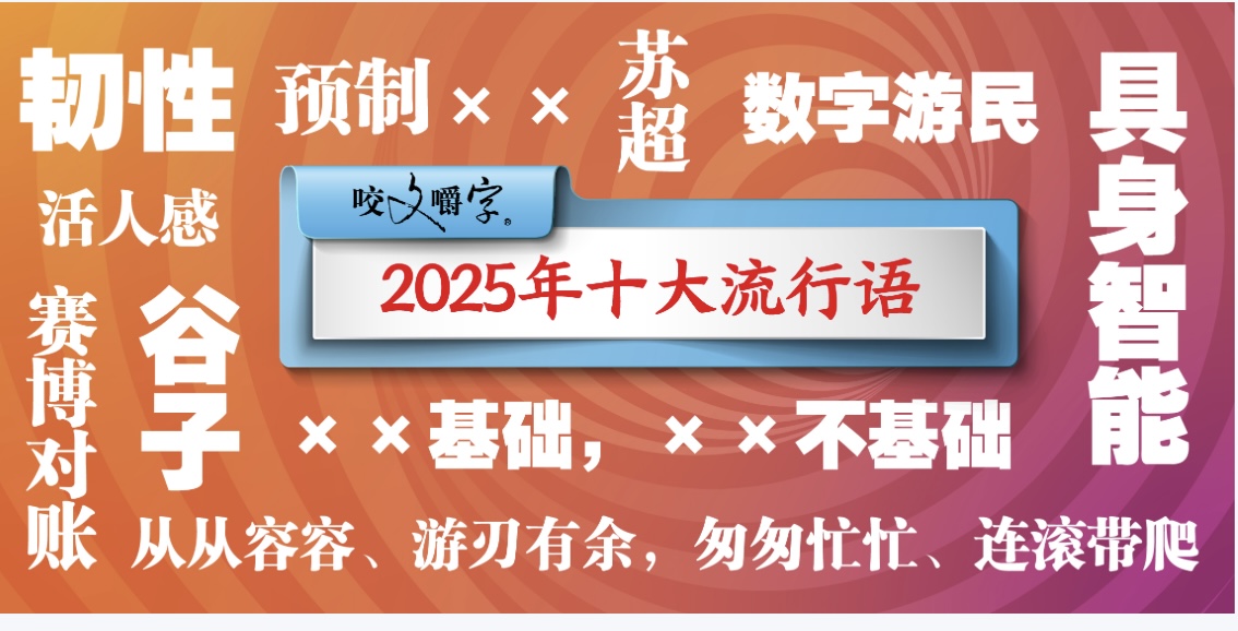 12月2日,有“语林啄木鸟”之称的语文杂志《咬文嚼字》编辑部发布2025年度十大流行语。韧性、具身智能、苏超、赛博对账、数字游民、谷子(英文单词goods的音译,本义为商品,流行语中特指动漫、游戏等二次元文化的衍生产品)、“预制××”、活人感、“××基础,××不基础”、“从从容容、游刃有余,匆匆忙忙、连滚带爬 ”入选。