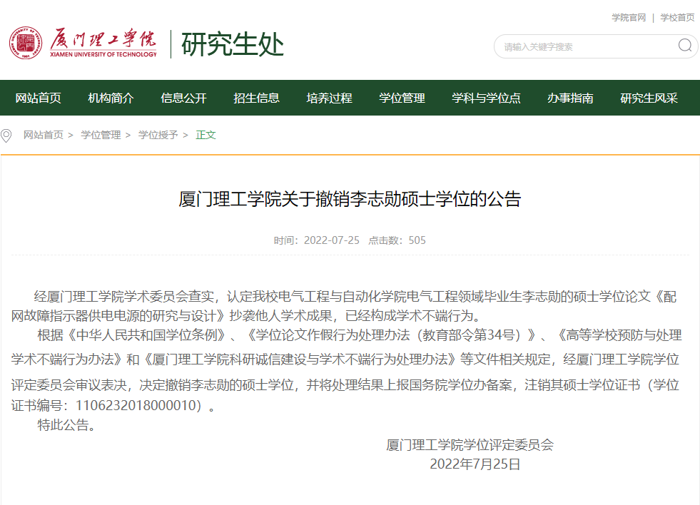 据厦门理工学院研究生处网站7月25日消息,经厦门理工学院学术委员会查实,认定学校电气工程与自动化学院电气工程领域毕业生李志勋的硕士学位论文《配网故障指示器供电电源的研究与设计》抄袭他人学术成果,已经构成学术不端行为。