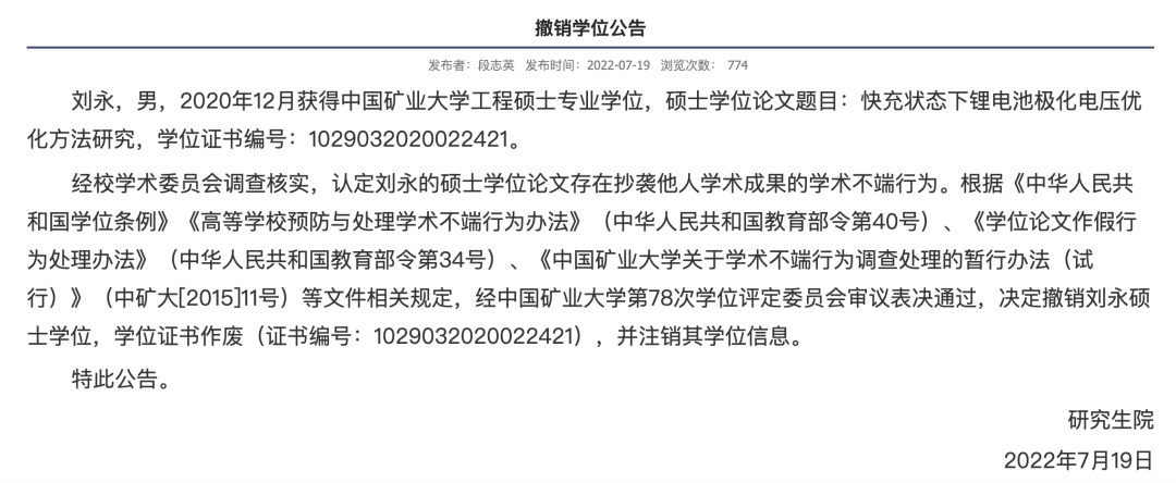 另据中国矿业大学研究生院网站7月19日公告,刘永,男,2020年12月获得中国矿业大学工程硕士专业学位,硕士学位论文题目:快充状态下锂电池极化电压优化方法研究,学位证书编号:1029032020022421。