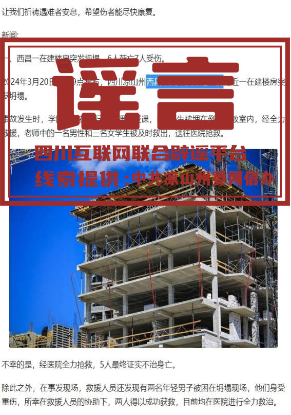 3月21日,有网民发帖称:“四川凉山一在建楼房陷塌致6人遇难7伤:调查组已成立!”帖文还称事故发生地点为四川凉山州西昌市天土镇师范学院附近。经凉山州委网信办联动西昌市委网信办和相关部门核实,西昌市辖区内没有“天土镇”和“天土镇师范学院”,且凉山州西昌市近日未发生过在建楼房陷塌致人员伤亡的事故,该帖文纯属谣言。