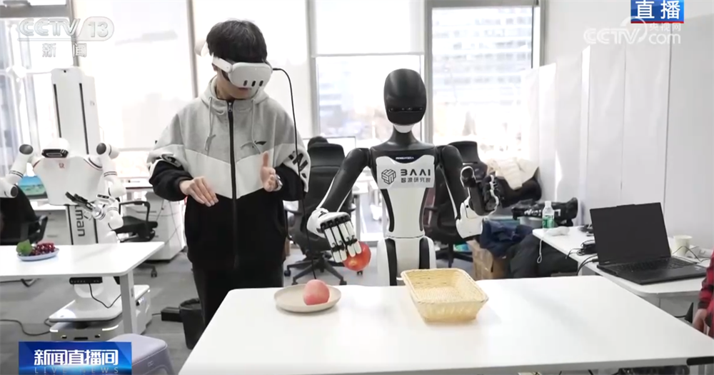 那您可能要问了,老师教学生讲究一个“言传身教”,那么,训练师和机器人之间是怎么交流的呢?您看,这位戴着VR眼镜、拿着操作手柄的训练师就正在给这台机器人上课。还有您看,当训练师按操作键时,机器人的手臂可以移动、手指也会进行抓取。还有的训练师会穿上布满传感器的动作捕捉衣,让机器人可以在更精准的数据指导下进行训练。机器人就是在这些数据的传输中,一遍一遍模仿,反复练习,从而提高每个动作的精准度。