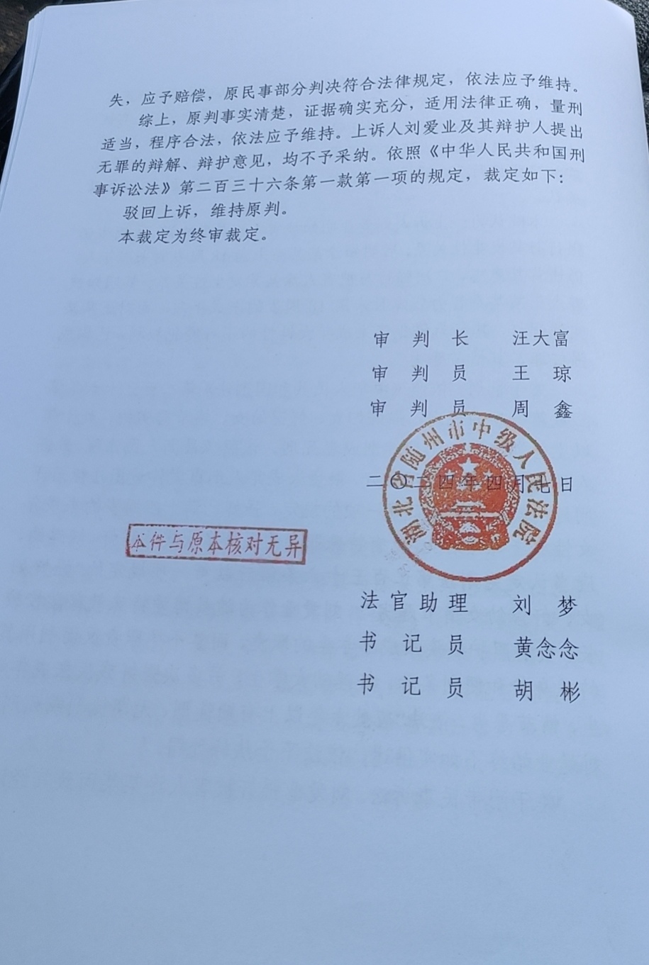 一审宣判后,刘爱业提起上诉。2024年3月19日,随州中院开庭二审。据一名出席庭审的家属介绍,刘爱业当庭否认强奸,并表示不愿进行民事赔偿。他们于4月8日收到了法院的二审裁定书。