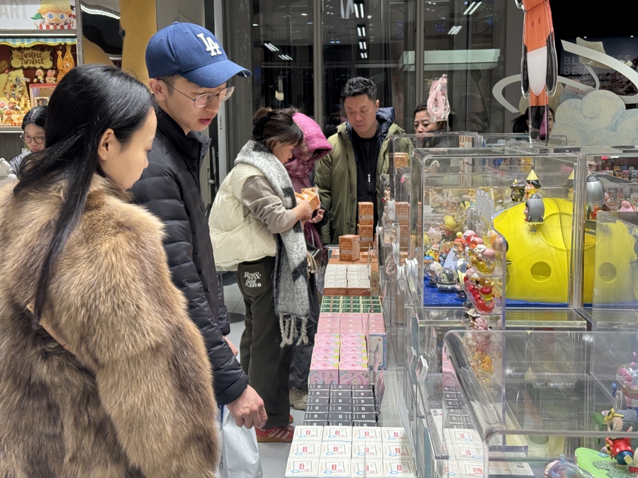 其中,热门IP拉布布(Labubu)的人气依旧高涨,新上市的款式吸引了很多消费者,一些经典旧款依然“仅供陈列”,没有现货。店员介绍说,如果想购买这些款式,可以加入门店会员群,了解配货情况;或者通过官方小程序预约,待到货后再购买。
