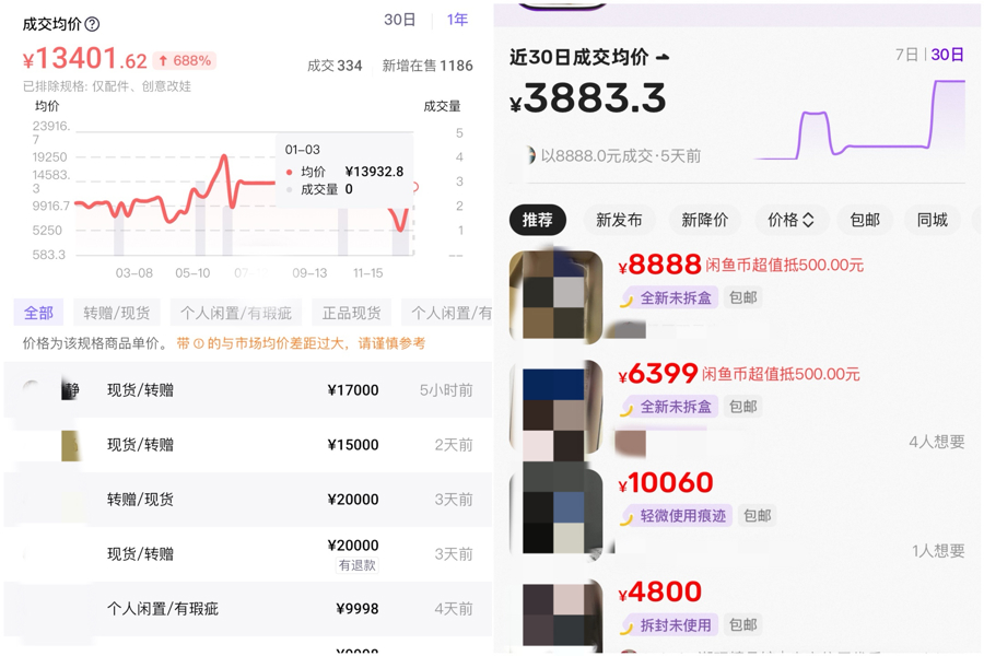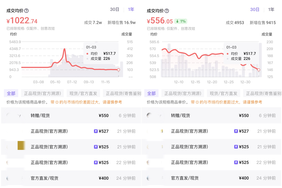 “本我”在某二手平台的成交价格变化,左图为近1年,右图为近30天