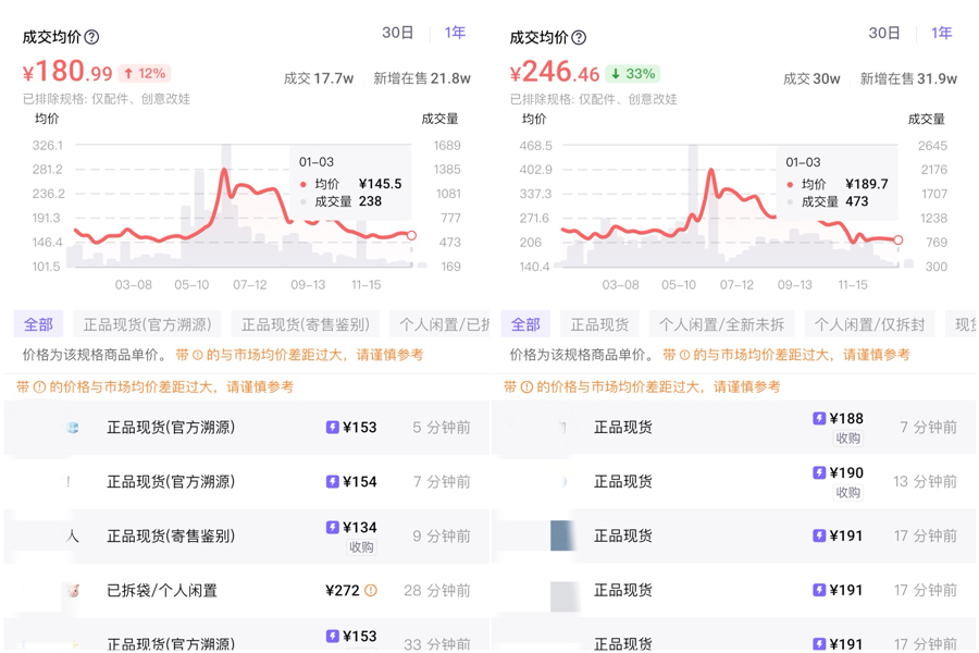 潮玩行业资深玩家杜群分析,这类产品发行量固定、IP附加值高,有稳定的玩家群体。价格高低与产品品相、买卖双方沟通等有关,“但是,这类产品并非日常消费品,它们的价格高低和变化不能代表普通产品价格”。