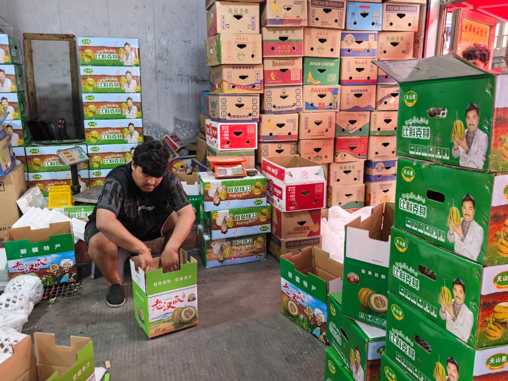 7月29日,新疆一家水果商户在打包老汉瓜。新华社记者 张瑜 摄