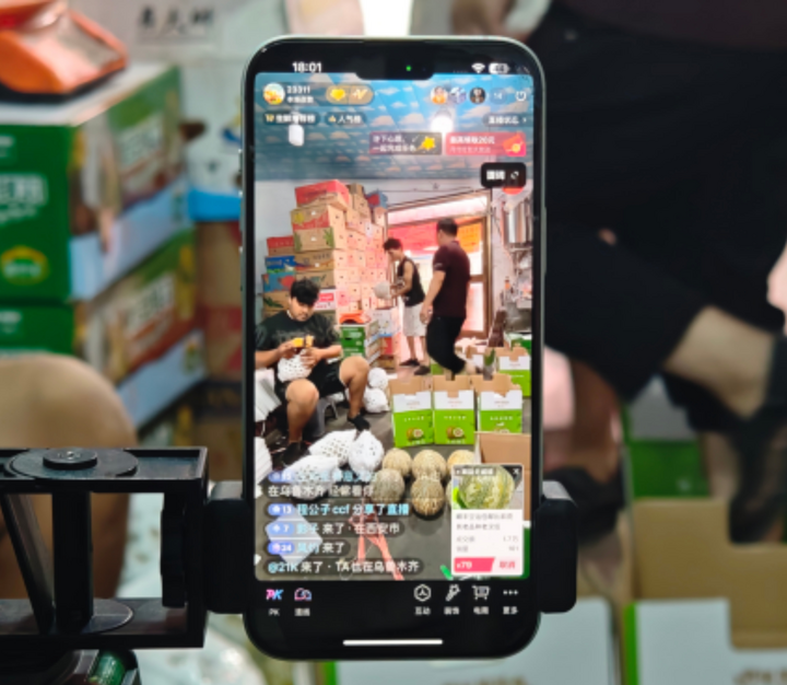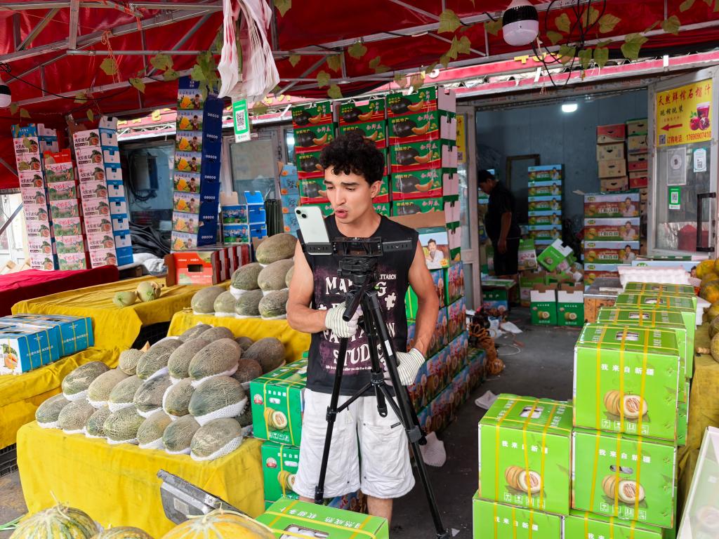 7月29日,新疆一家水果商户在直播销售老汉瓜。新华社记者张瑜 摄