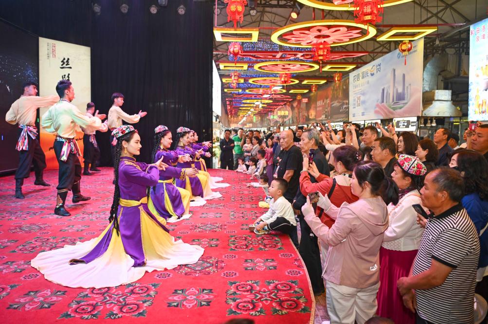 2025年4月15日,新疆和田市文工团的演员在和田夜市上演出。新华社记者 胡虎虎 摄
