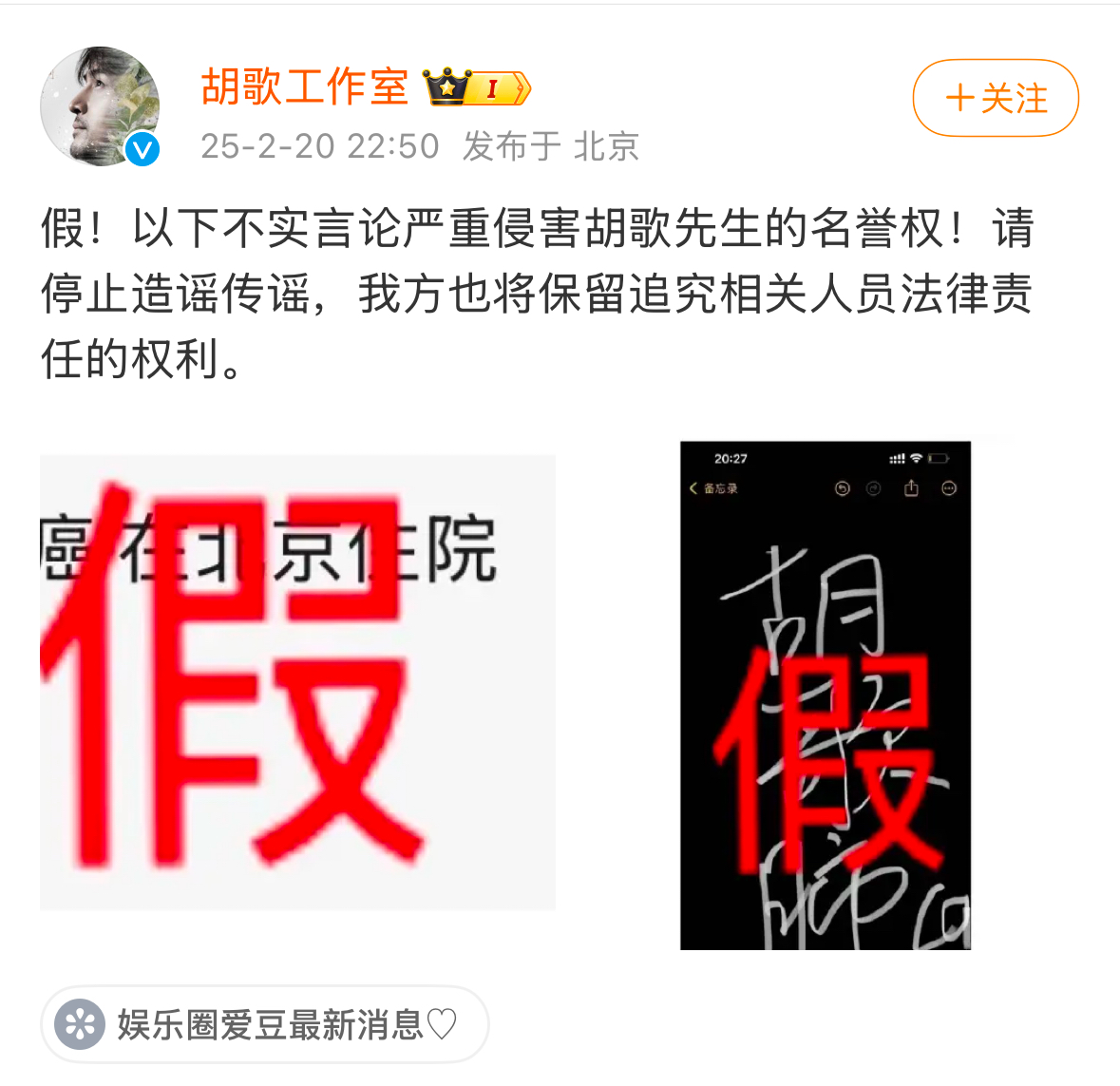 2月20日,“胡歌患肺癌住院”的谣言在社交平台疯狂传播,工作室紧急辟谣:假!