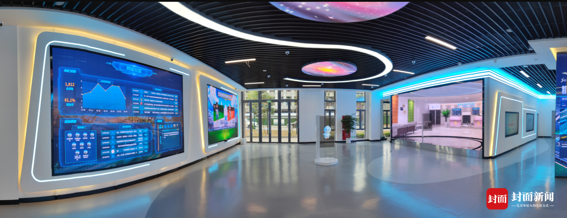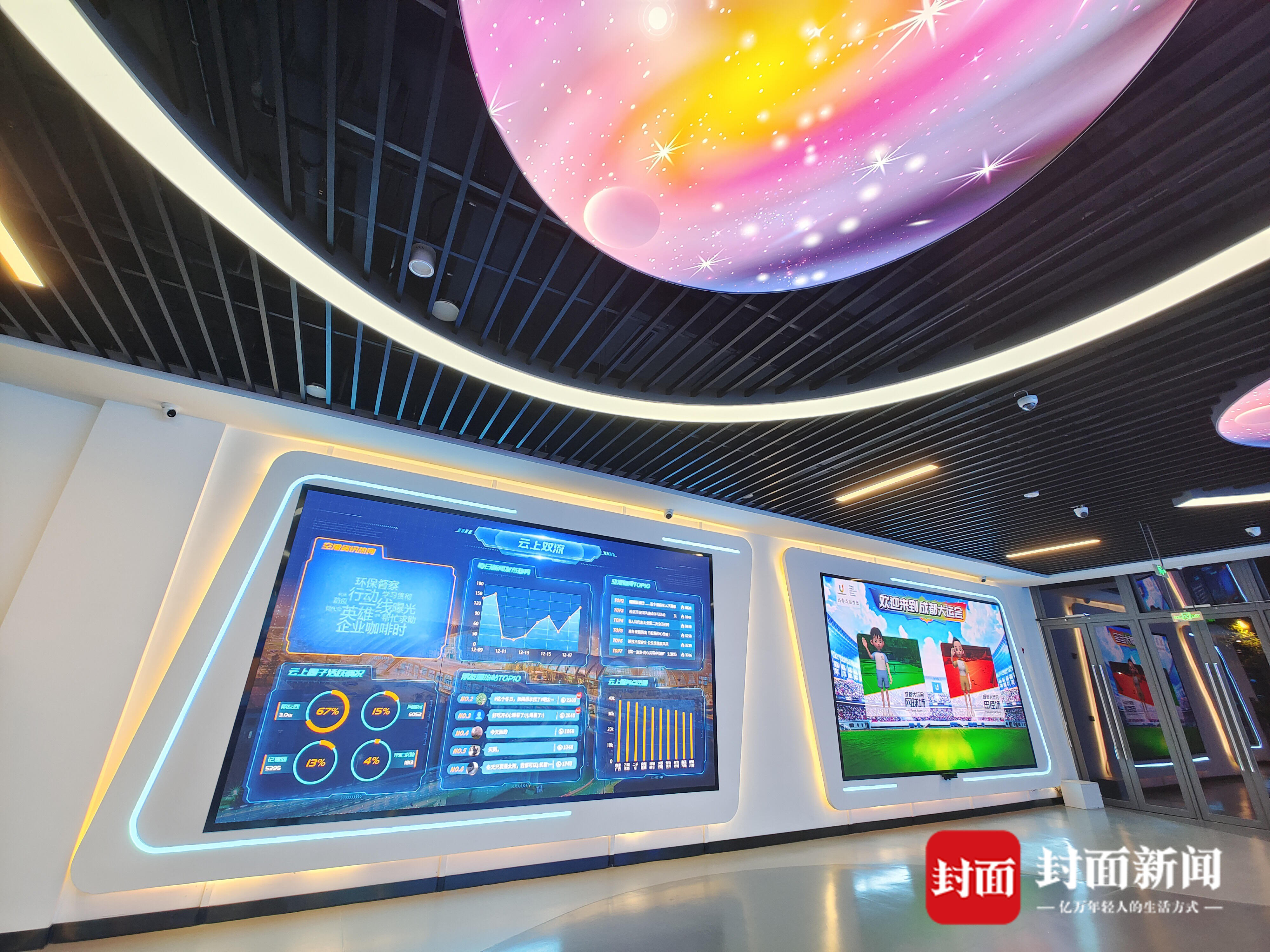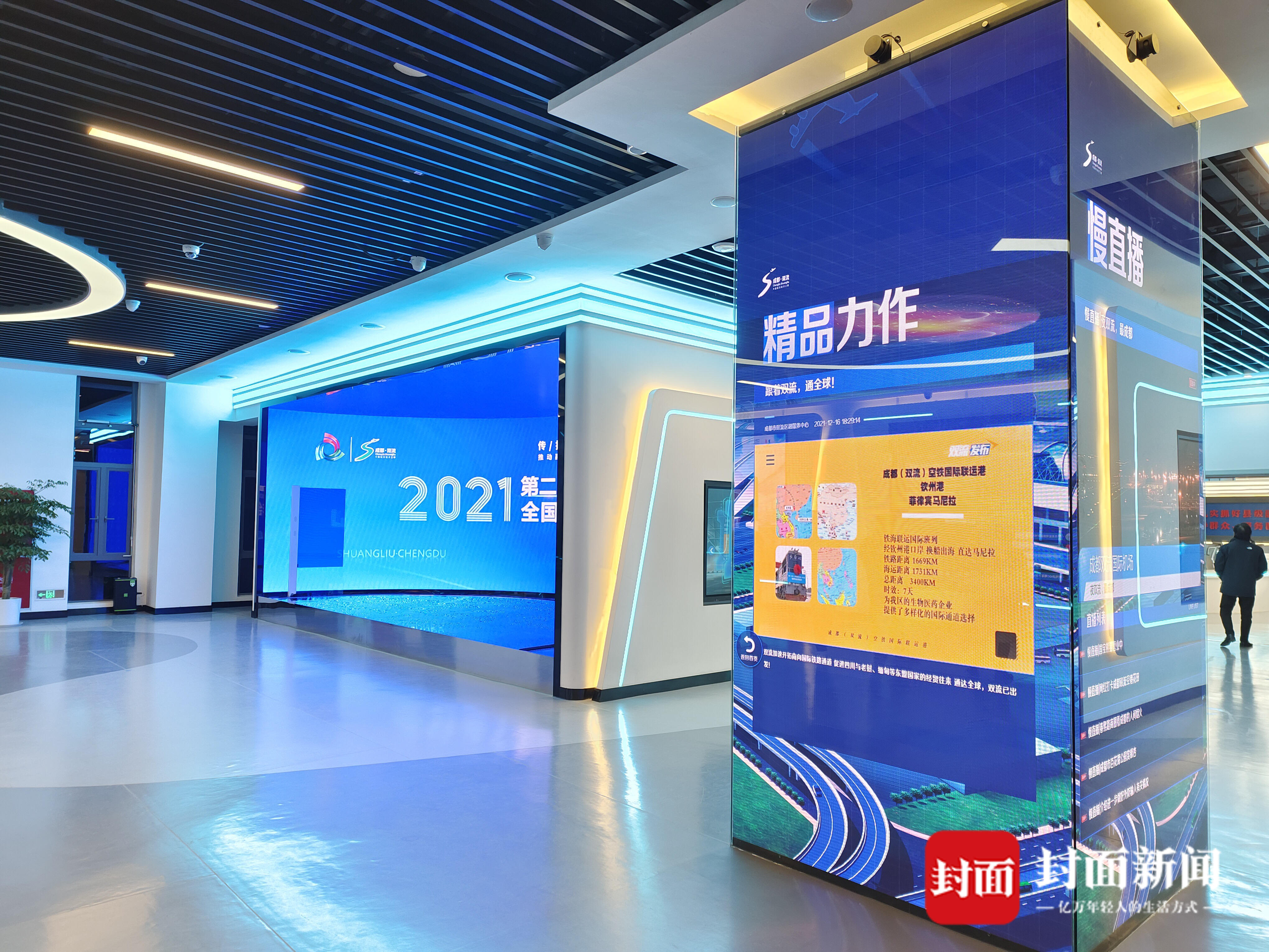 大厅中央的“柱子”吸引了大家目光,这是展厅“第一视窗”区域,“柱子”四面都是落地大屏,滚动展示着本地资讯:慢直播区,是空港花田对面的双流国际机场灯火通明;精品力作区,是双流籍四川首位航天员叶光富的成长故事;重大资讯播报区,是本届年会当天议程的精彩瞬间……触控屏幕,可以返回列表,滑动查看其他内容——其展示内容与双流区融媒体中心“云上双流”APP无缝对接。