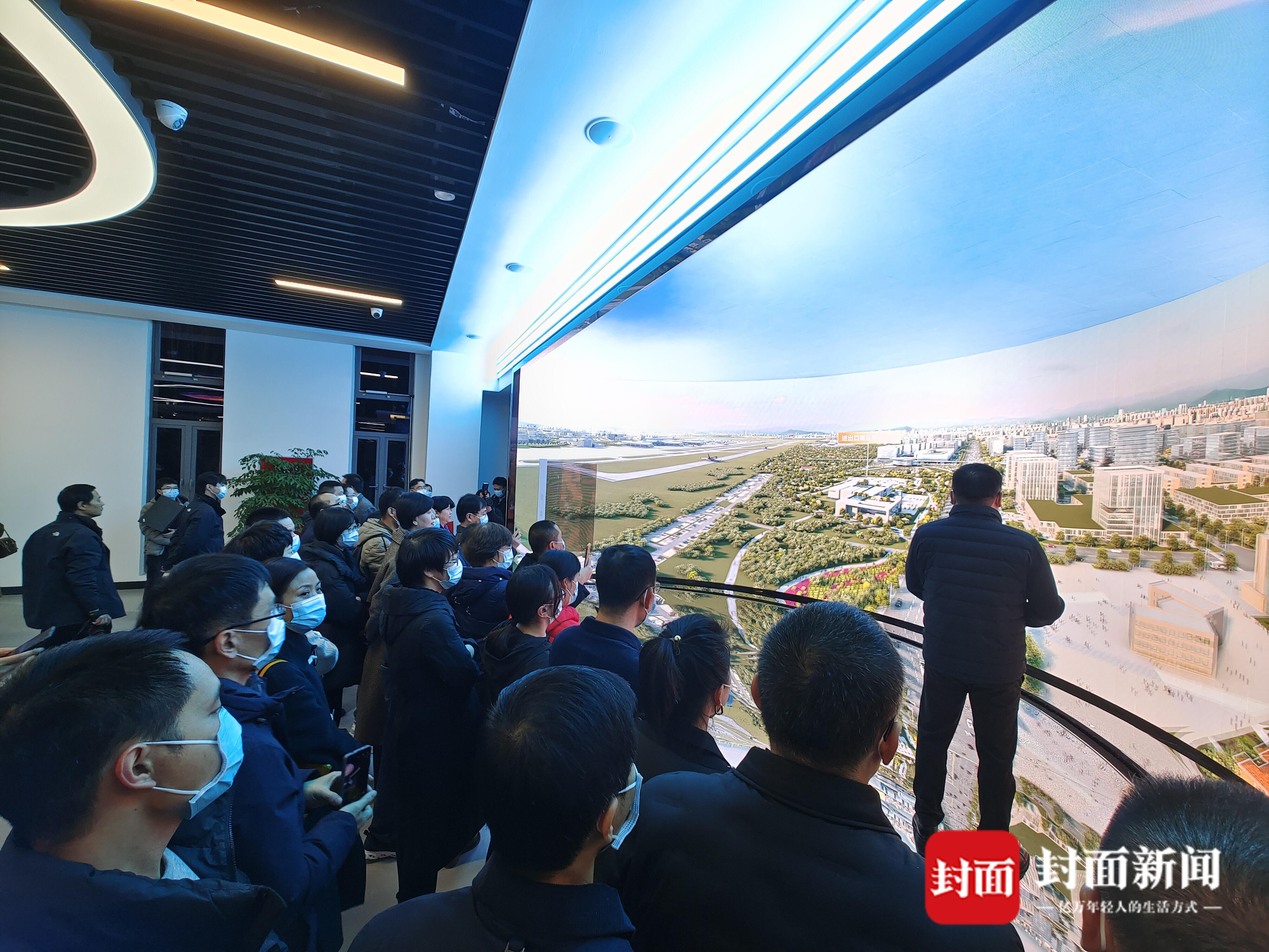 大尺寸弧形屏+天幕屏+镜面,在硬件搭配“无死角”的沉浸式体验区,《飞跃空港》影片将航空港商务区呈现为集游览感、真实感、未来感于一体的创新空间。影片以飞行员第一人称视角,体验航空港商务区内:一带、一湾、一谷、一廊所带来的产业、功能、形态、空间、生活方式。身临其境的场景、振奋人心的音乐,使人仿佛航游于空港商务区之上,深度呈现的新闻场景嘉宾们印象深刻。