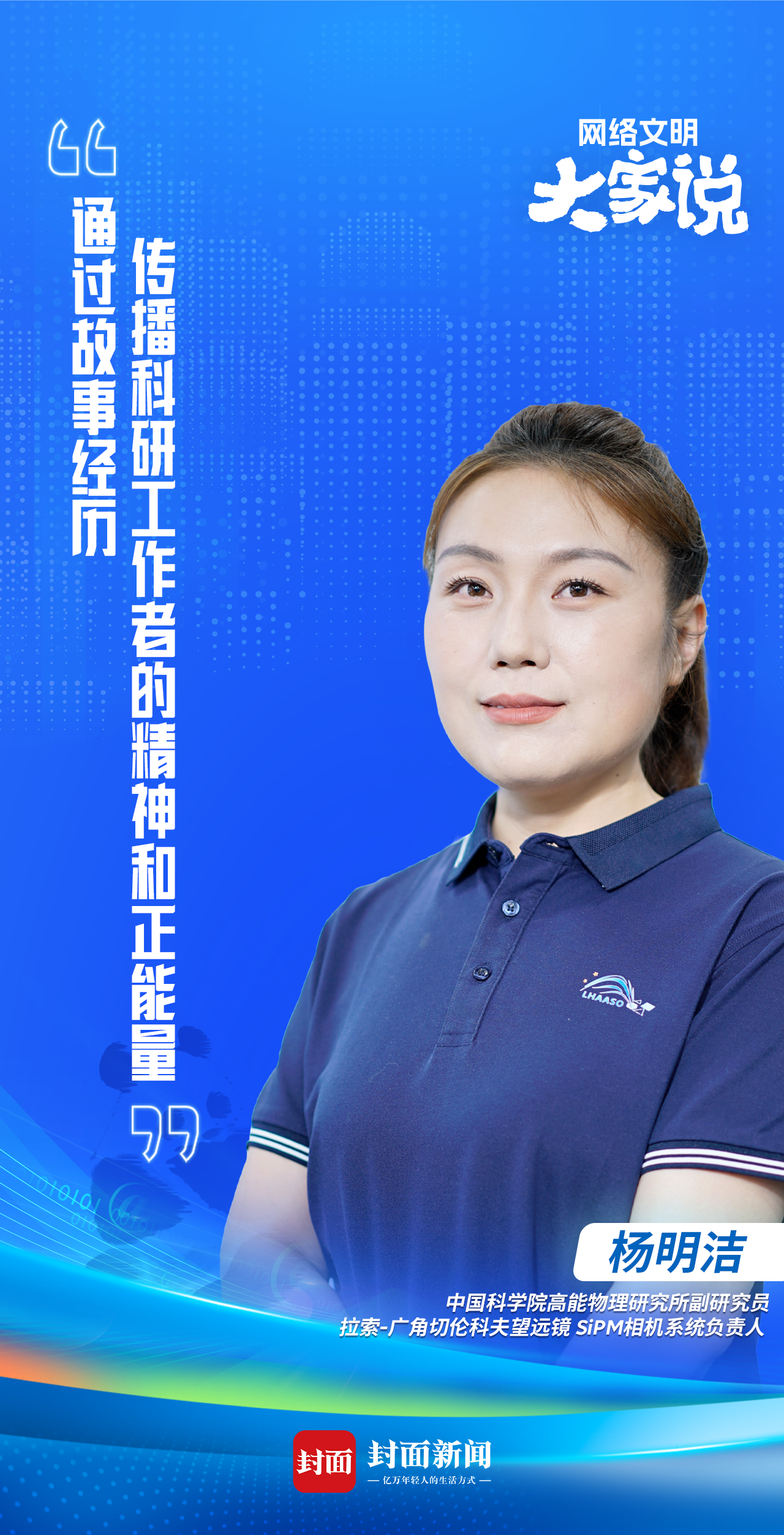 “我想,我们拉索团队可以通过分享团队的故事和成果来讲述科学家精神、传播励志向上的正能量。”8月28日-8月29日,2024中国网络文明大会在成都举行。聚焦“科技+青年”,看见中国维度。8月27日晚,“未来之夜——让科技之光点亮网络文明”网络互动引导活动在电子科技大学举办。90后科研工作者、中国科学院高能物理研究所副研究员、拉索望远镜SiPM相机系统负责人杨明洁分享了她参与大科学装置——高海拔宇宙线观测站“拉索”建设的点滴故事。