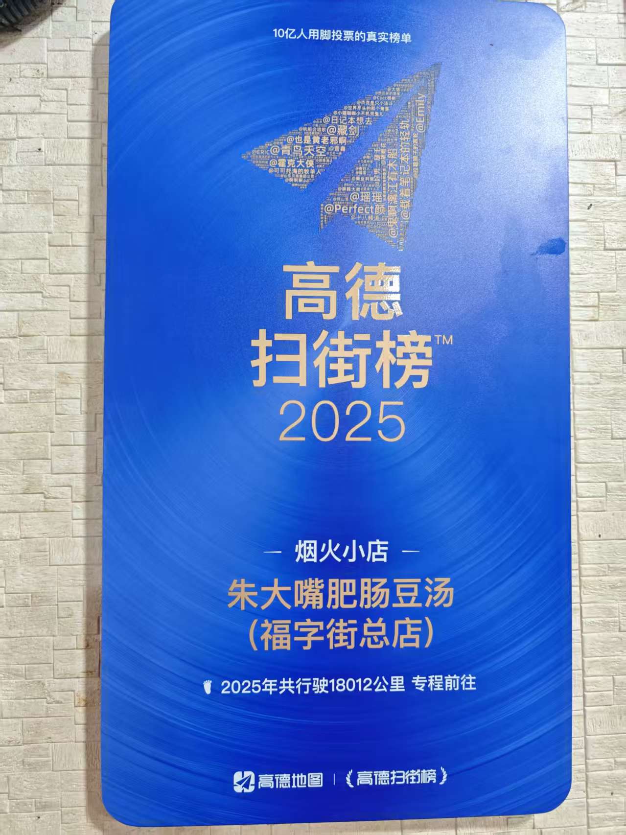 店门口,一块蓝色的纪念牌挂在墙上,上书“高德扫街榜2025烟火小店”,下面还有一行小字“2025年共行驶18012公里专程前往”。店主朱雷说,正是这行小字打动了他,所以他才把这块纪念牌挂在了店门口,作为唯一一张对外展示的“奖状”。