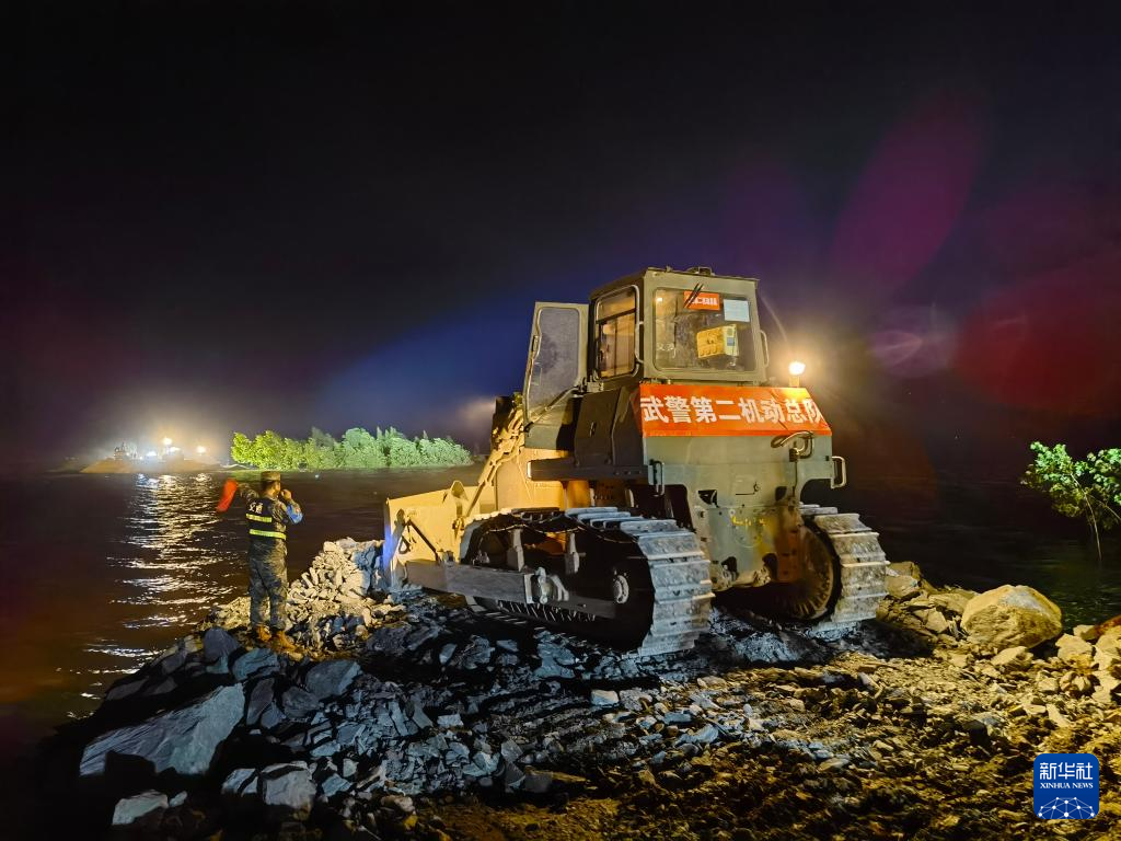 7月7日凌晨,在湖南省岳阳市华容县团洲垸洞庭湖一线堤防决口处,武警部队官兵操纵工程机械封堵决口。新华社记者 李秉宣 摄