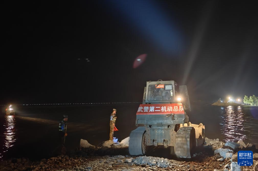 7月7日凌晨,在湖南省岳阳市华容县团洲垸洞庭湖一线堤防决口处,武警部队官兵出动照明车为施工现场提供照明。新华社记者 李秉宣 摄