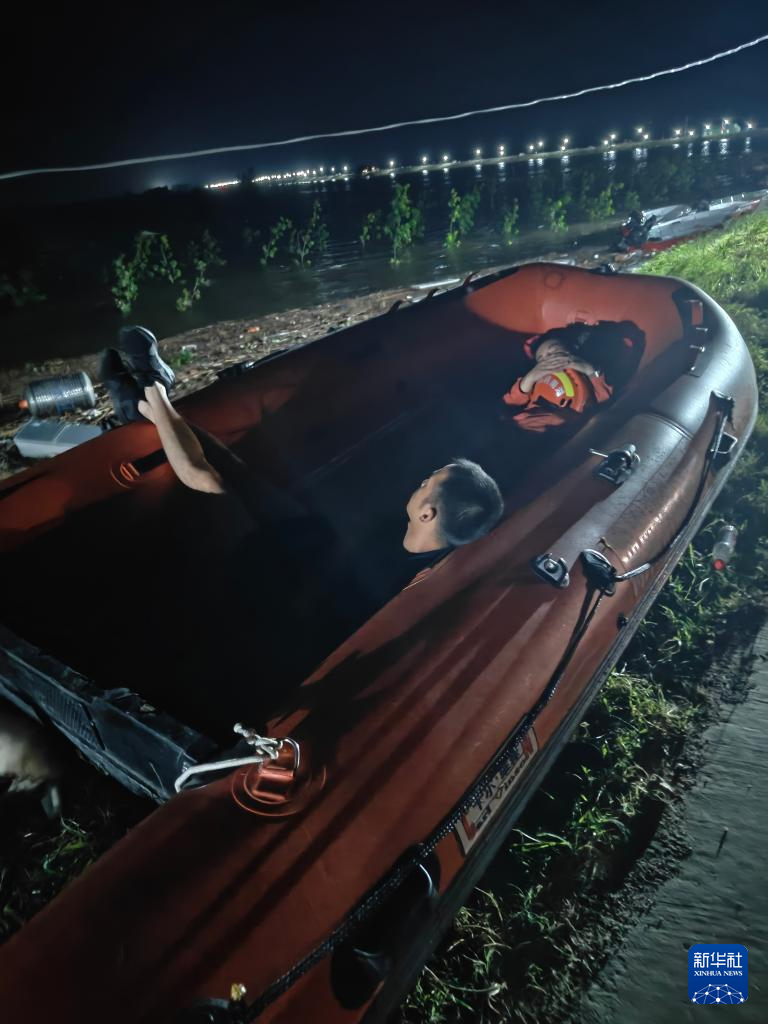 7月7日凌晨,在湖南省岳阳市华容县团洲垸洞庭湖一线堤防决口处,随时待命的抢险救援人员在橡皮艇里小憩。新华社记者 黎云 摄